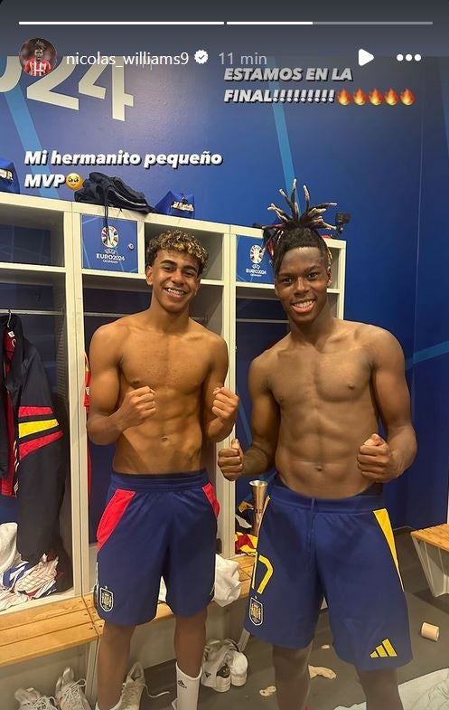 Ya en los vestuarios, los dos futbolistas han cumplido con otra tradición: una foto en el vestuario sin camiseta celebrando el pase, como ya hicieron en cuartos. «Mi hermanito pequeño, MVP», presumía Nico sobre el premio a mejor jugador del partido, que recayó en Yamal.