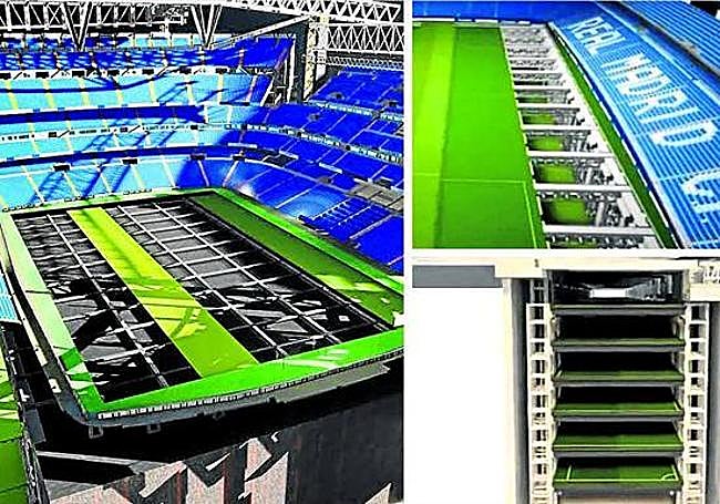 Este novedoso sistema no necesita espacios anexos al estadio para albergar los paneles de césped, lo que es fundamental para campos urbanos como el Bernabéu. «Desplaza una serie de bandejas con el césped a una cámara subterránea dentro del propio estadio, a la que llamamos hipogeo». Y por otro lado, «construimos una especie de invernadero debajo del estadio capaz de reproducir las condiciones ambientales óptimas para el mantenimiento».