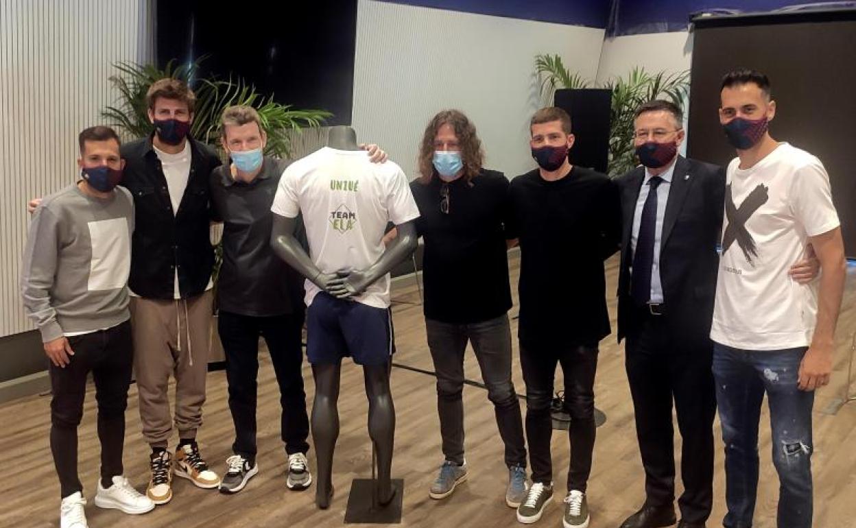 Juan Carlos Unzué (3i), junto a Gerard Piqué y Jordi Alba en el Camp Nou. EFE