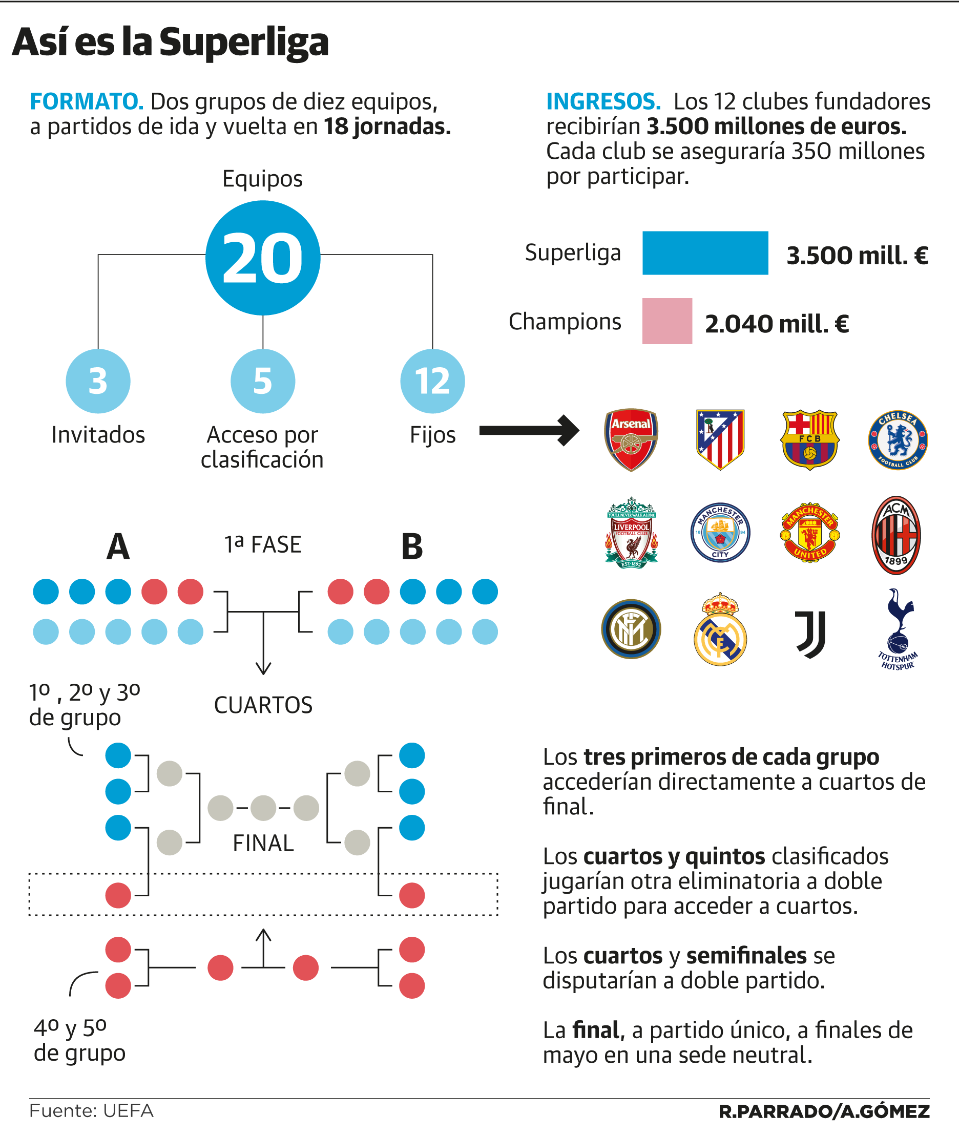 La Superliga europea involucrará a veinte equipos cada temporada. Quince de esas plazas serán fijas. Corresponderán a los doce miembros fundadores -Milan, Arsenal, Atlético de Madrid, Chelsea, Barcelona, Inter de Milán, Juventus, Liverpool, Manchester City, Manchester United, Real Madrid y Tottenham-, más otros tres que serán invitados a unirse antes de la campaña inaugural -candidatos como el Bayern o el Borussia Dortmund ya se han posicionado en contra y el PSG también se mantiene al margen-, cuyas fechas aún no han sido precisadas porque el proyecto sigue envuelto en la incertidumbre ante las amenazas de los órganos rectores del fútbol en lo que no es sino una guerra por controlar el negocio. Los cinco participantes restantes se clasificarán anualmente sobre la base del rendimiento de la temporada anterior, sin que por el momento se haya precisado el sistema de acceso de esos clubes -seguramente en función de su clasificación en las cinco principales ligas europeas-. Se trataría, por tanto, de un sistema casi cerrado, equiparable al que rige en las ligas norteamericanas de baloncesto (NBA), fútbol americano (NFL), béisbol (MLB) o hockey sobre hielo (NHL).