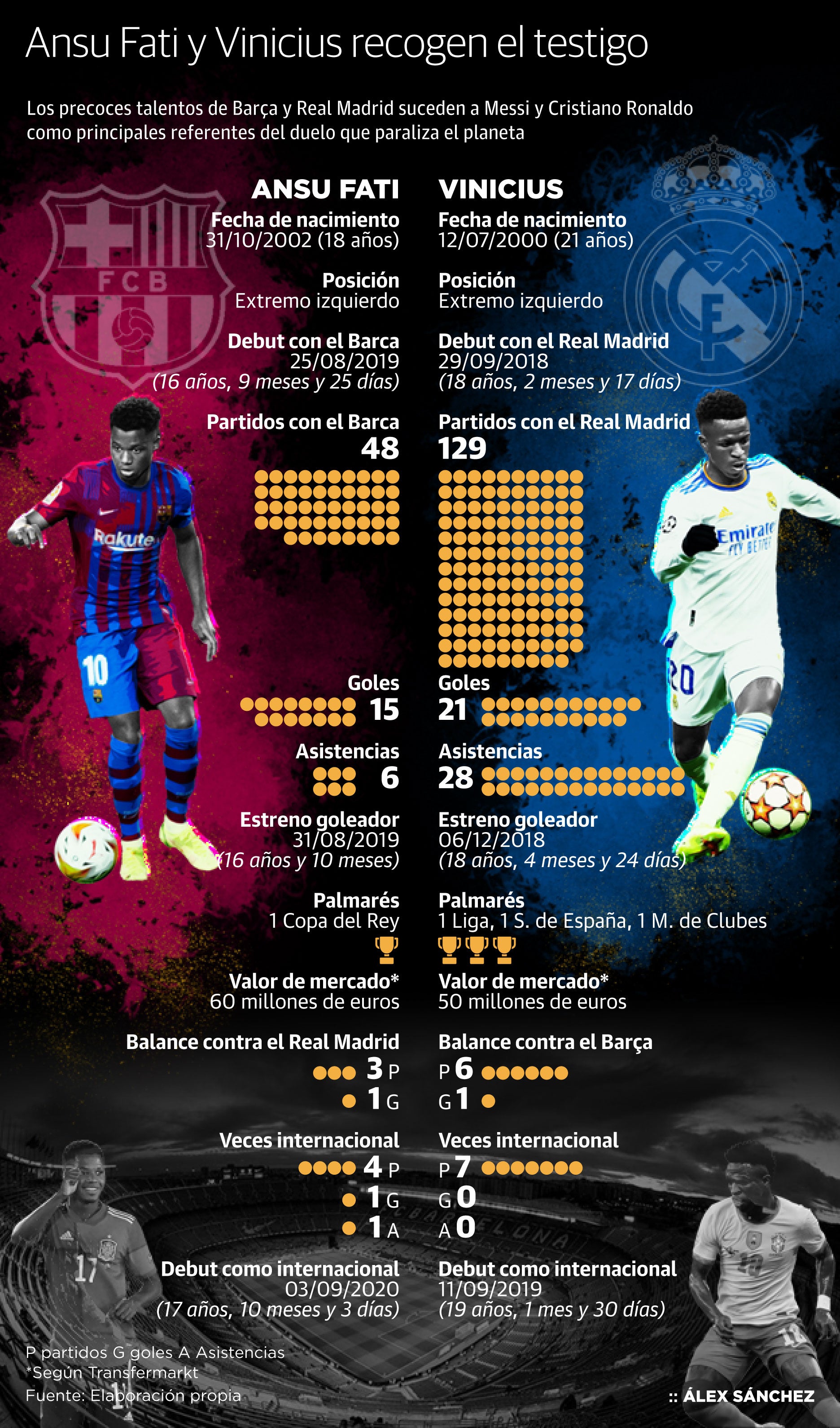 Durante su cohabitación, los cracks monopolizaron un enfrentamiento que el domingo se quitará las arrugas. Ansu Fati y Vinicius lideran el relevo generacional del litigio con mayor resonancia del orbe. La salida de los astros que tiranizaron el deporte rey durante la pasada década ha dejado un vacío de poder que se aprestan a cubrir dos joyas con un futuro espléndido, pero capacitados ya para desnivelar el presente.