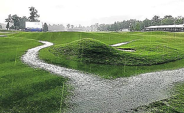 Jon Rahm y Ryan Palmer se detuvieron en el hoyo 7. El único birdie robado al recorrido lo firmó el jugador texano de Amarillo en el 2 con un putt de menos de tres metros. Antes lo pudo anotar el de Barrika, pero la bola tocada desde un par de metros en el 1 se negó, físicamente, a caer en la cazoleta. Ambos acompasaron su juego con buenas salidas y segundos golpes no lo suficientemente cercanos para generar más opciones de resta. En el 6 Rahm tomó el relevo para salvar el par después de que su coequipier se fuera al agua en la salida. Y en el 7, en el momento en que tuvieron que marca bola y escapar de la tromba de agua, el vizcaíno había llegado al green de ese par 5 con el segundo golpe y reanudaría la actividad pateando para eagle desde 14 metros.