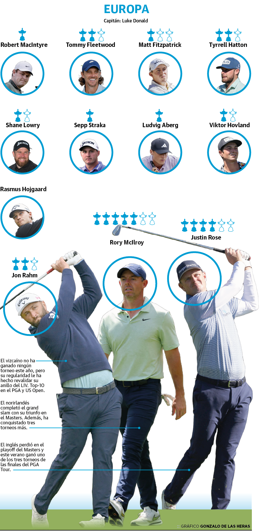 En este contexto desembarca en territorio enemigo la Europa de Jon Rahm y Rory McIlroy, las dos máximas figuras del combinado que dirige Luke Donald. Serán muy importantes también golfistas en plena forma como Robert MacIntyre o Tommy Fleetwood. Donald repite en el cargo tras el éxito en Roma y lo hace acompañado de José María Olazabal, leyenda de la Ryder. El de Hondarribia, dos veces ganador del Masters de Augusta, es uno de los cinco vicecapitanes. Los hermanos italianos Edoardo y Francesco Molinari, el sueco Alex Noren y el danés Thomas Bjorn, capitán en el triunfo en París 2018, en la primera experiencia de Rahm en el torneo, completan la lista de ayudantes del inglés.