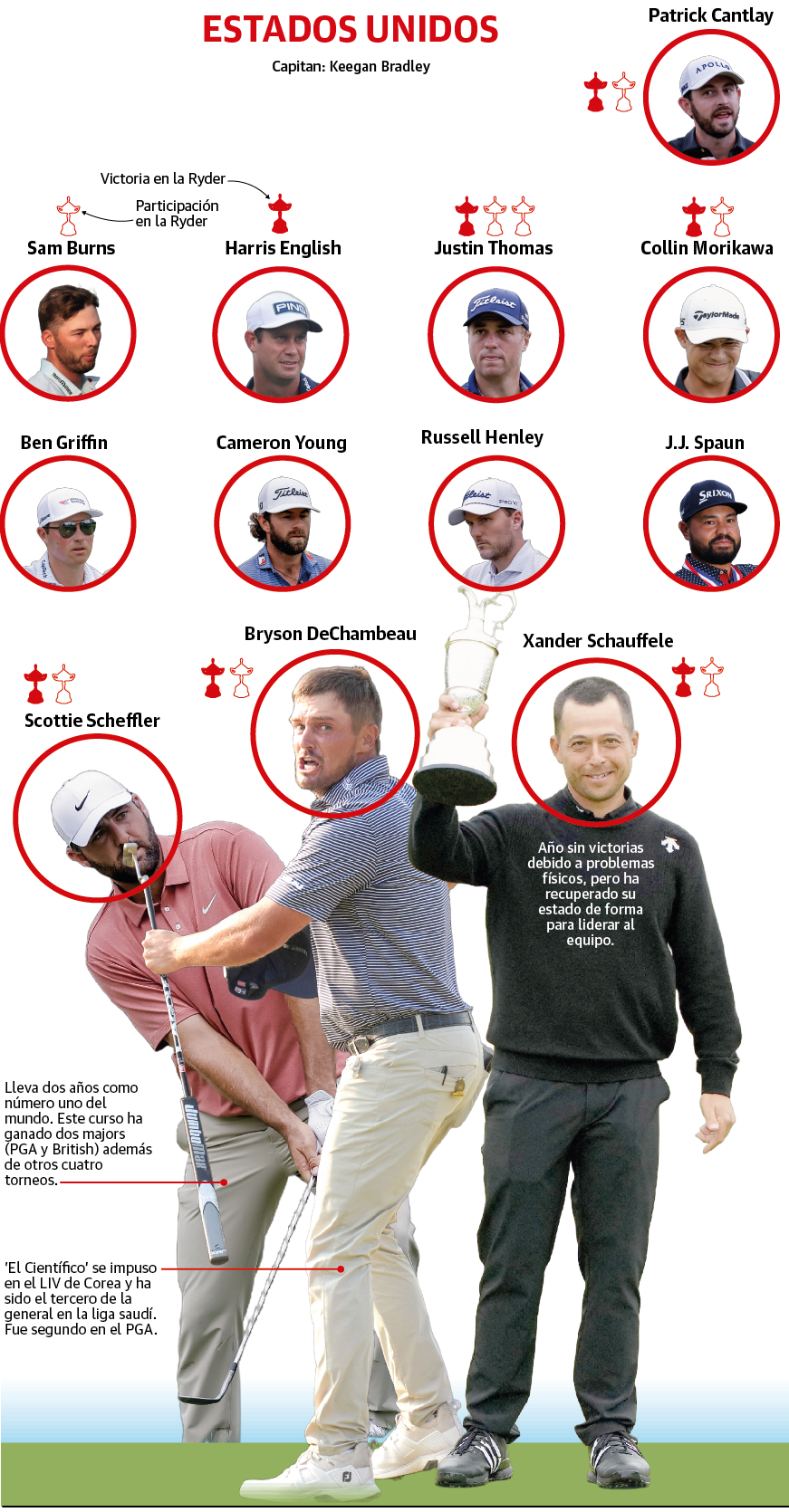 El bando americano está dirigido por Keegan Bradley, sobre el que hasta el último momento se ha especulado con que pudiera actuar también de jugador, y liderado en el campo por Scottie Scheffler, el número uno del mundo. Bryson DeChambeau, entre otros, promete ser una de las figuras que quieren amargar la semana a Europa. Xander Schauffele, ganador en 2024 de dos 'majors', ha dado un paso atrás en este curso debido a problemas físicos, pero está recuperado. Además de Rahm y DeChambeau, hay un tercer miembro del LIV en el torneo: el inglés Tyrrell Hatton. Por tanto, por primera vez el circuito saudí celebrará un ganador de sus filas. En Roma estuvo Brooks Koepka, aunque en el bando perdedor.