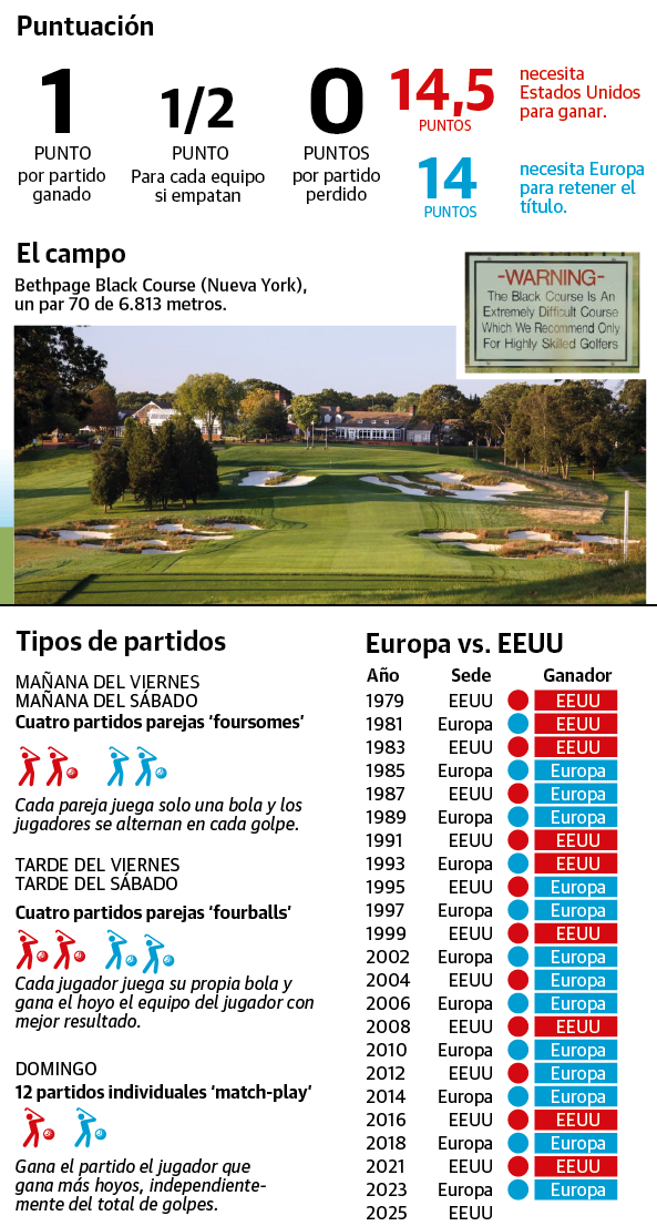 Bethpage Black Course es el espectacular complejo que acoge la Ryder. Se ubica en Nueva York, en concreto en Long Island, la extensa isla que se alarga al este de la Gran Manzana. Según los expertos, es uno de los campos más complicados de Estados Unidos. Lógico, hablando de una Ryder. Pero la cosa va más allá: una placa avisa a navegantes de su dificultad. Junto al tee del 1 se lee «Atención, el Black Course es un campo extremadamente difícil, solo recomendado para jugadores altamente cualificados». Como los 24 que se reunirán los próximos días. Ubicado en un enorme recinto con otros cuatro campos más, es de titularidad pública y se conoce como «El club privado del pueblo». Eso sí, lleva un tiempo cerrado a cal y canto para estar en perfecto estado de revista para el gran torneo.