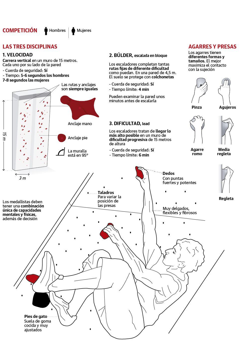 La escalada deportiva he hecho su debut olímpico en Tokio con tres disciplinas: velocidad (dos escaladores compiten por subir más rápido en una pared de 15 metros), búlder o escalada en bloque (los deportistas escalan en cuatro minutos tantas vías fijas como puedan en una pared de 4,5 metros) y lead o dificultad (en seis minutos se intenta escalar lo más alto posible en una pared de más 15 metros).