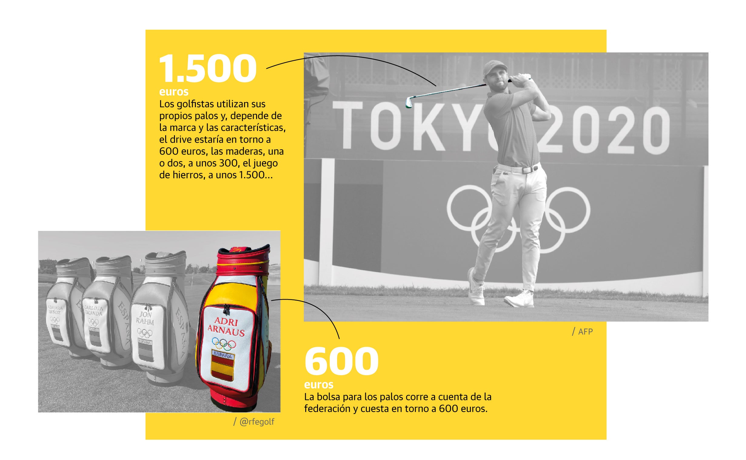 «Son sus propios palos», aseguran en la Federación Española de Golf sobre el material que han llevado a los Juegos Carlota Ciganda, Azahara Muñoz, Adri Arnaus y Jorge Campillo. Estaba en esta lista Jon Rahm, cabeza de lista de la delegación española que no llegó a debutar al dar positivo por coronavirus. El total, como en muchos de los casos, no es exacto porque los precios, marcas y cantidades pueden variar. Arnaus, por ejemplo, cuenta en su web personal qué lleva en su bolsa. Tomando los datos aportados por la federación, el drive estaría en torno a los 600 euros, las maderas, una o dos, a unos 300, y el juego de hierros, a unos 1.500. El putter puede salir por 400, tres wedges pueden costar 750 euros, los zapatos son unos 150 o 200 y unas tres decenas de bolas salen por unos 180 euros… La bolsa para los Juegos, con los colores de España, cuesta cerca de 600 euros y la aporta la federación.