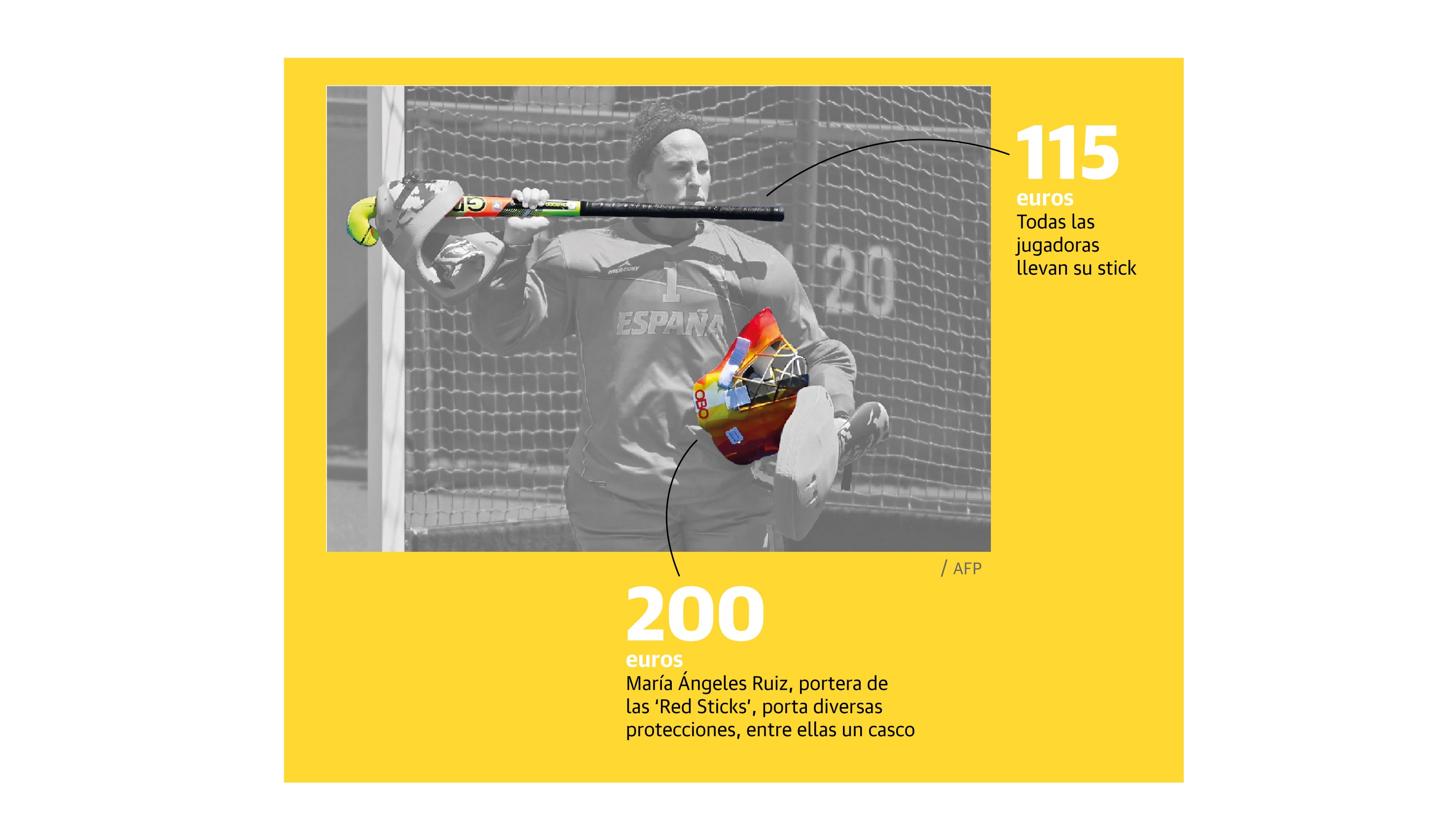 Y son cerca de 2.000 euros en material lo que ha llevado encima estos días María Ángeles Ruiz bajo los palos de las 'Red Sticks'. El casco cuesta 200 y hasta el total entran todo tipo de protectores: de pies (220), brazos (74), guantes (340), de piernas (74), de las partes pudendas (24)... El stick, eso lo llevan todas, vale 115 euros.