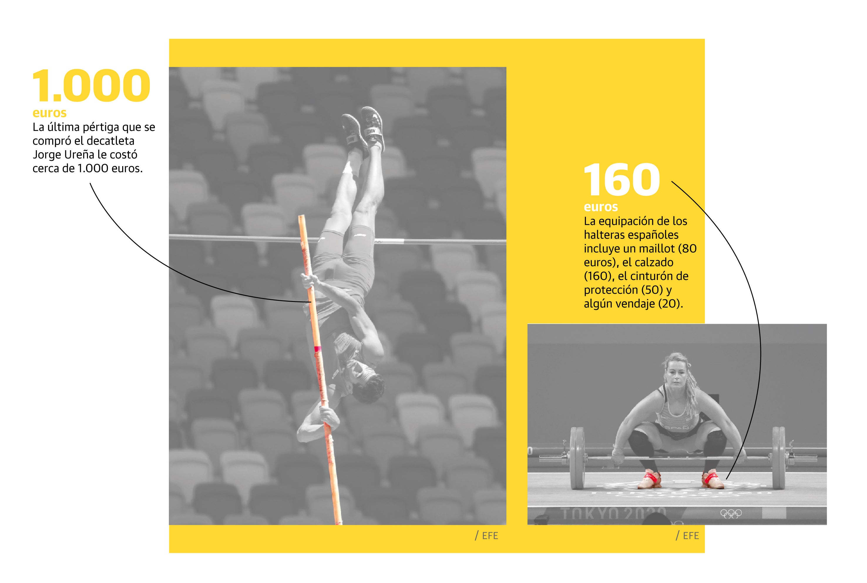 Otro ejemplo es el de Jorge Ureña, el decatleta que ha sido noveno en Tokio y que viaja con un tubo de cinco metros con seis pértigas. Eso no es por si se rompen, sino que cada una, según su rigidez, sirve para una altura. La última que compró le salió por unos 1.000 euros. La equipación corre a cuenta de la federación, pero las zapatillas de clavos, «depende de si pillas alguna oferta», van de los 80 a los 120 euros. Lleva al menos «siete u ocho contando el calentamiento». Y a los Juegos solo lleva las pértigas porque por norma es la organización en este caso la que pone el material con el que compiten los deportistas en el resto de las diferentes pruebas atléticas, como la jabalina, el martillo o la bola de lanzamiento de peso.
