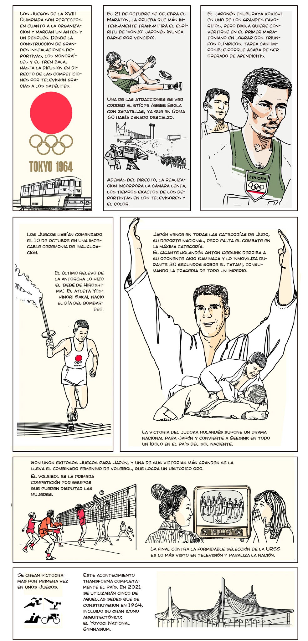 Su brillante organización marcó un antes y un después en las citas olímpicas: se vieron por televisión, se construyeron enormes instalaciones deportivas, el tren bala...