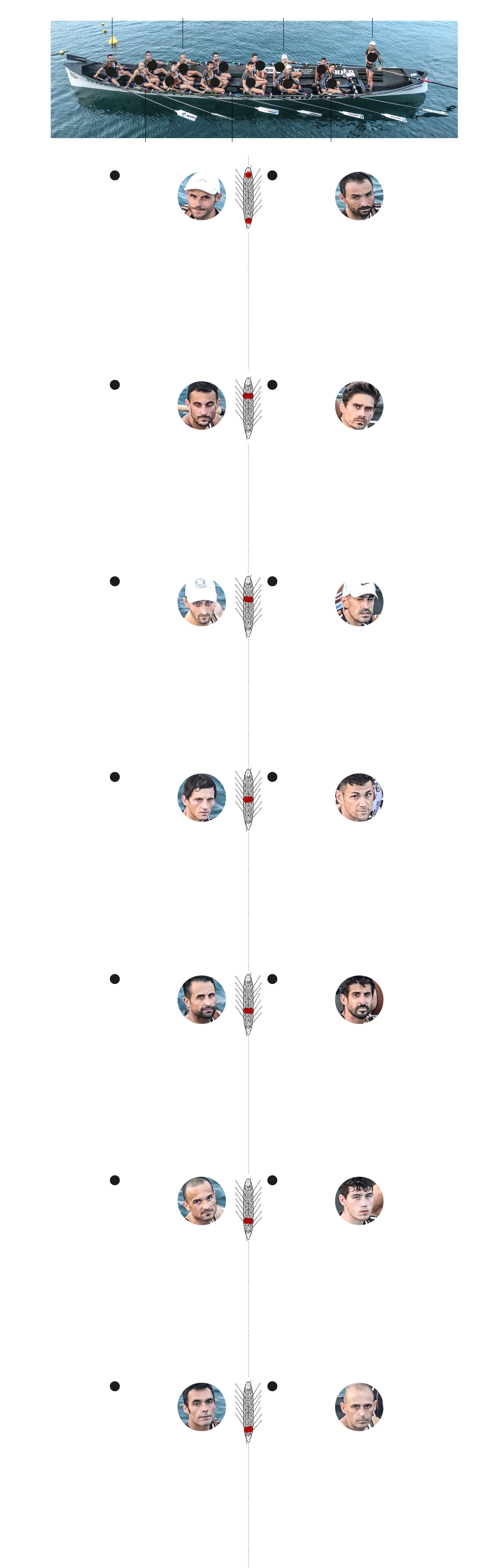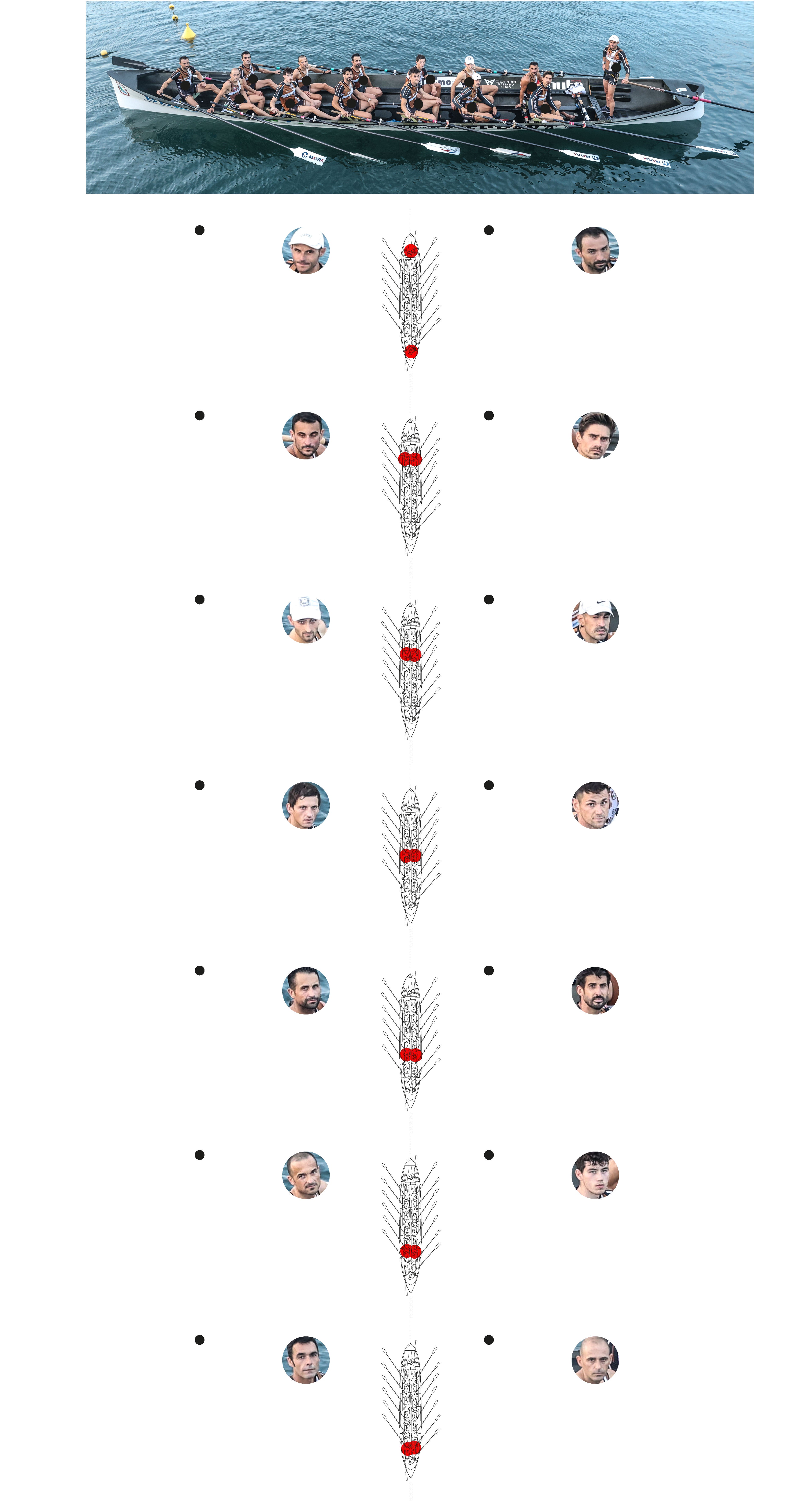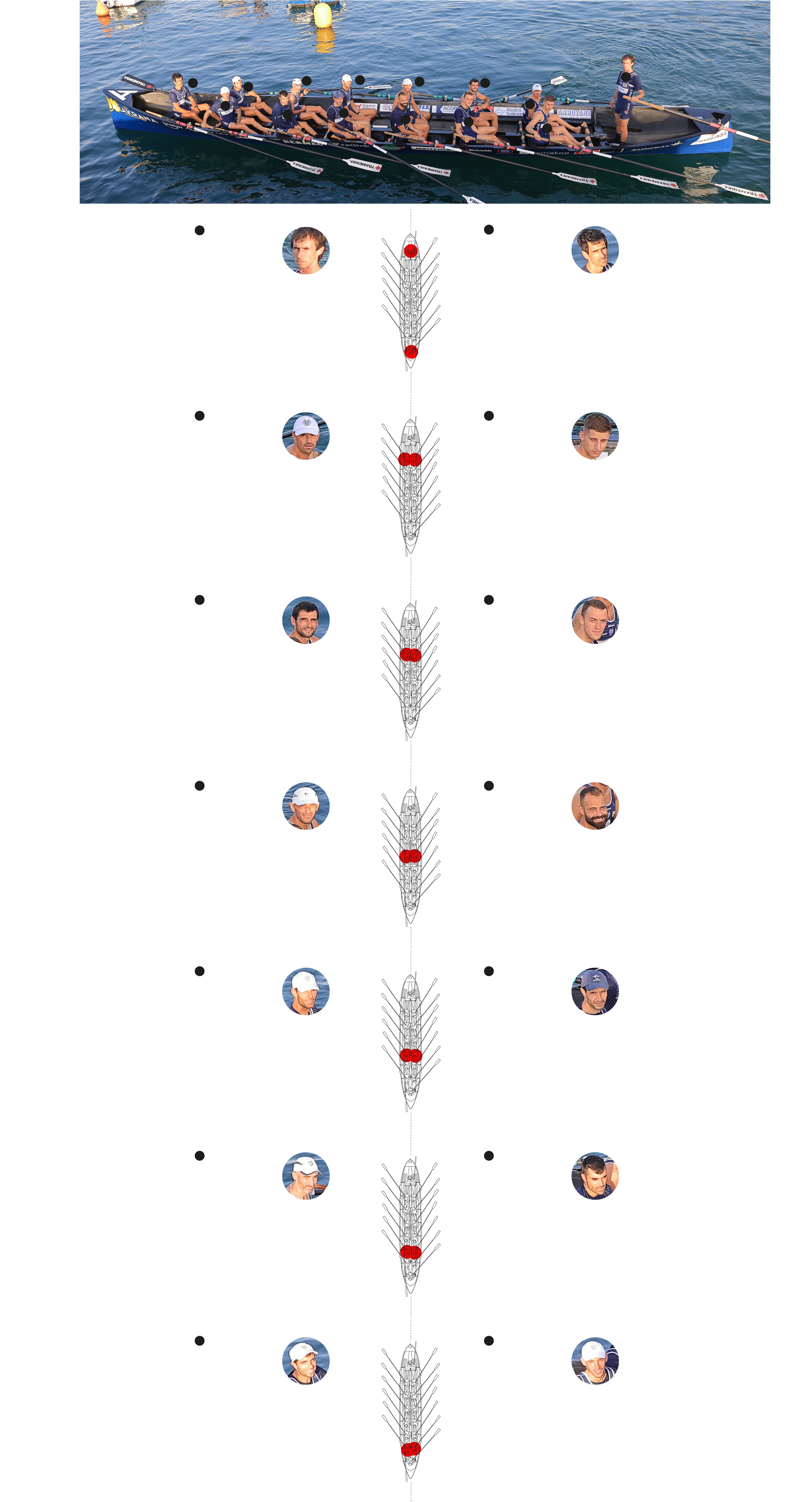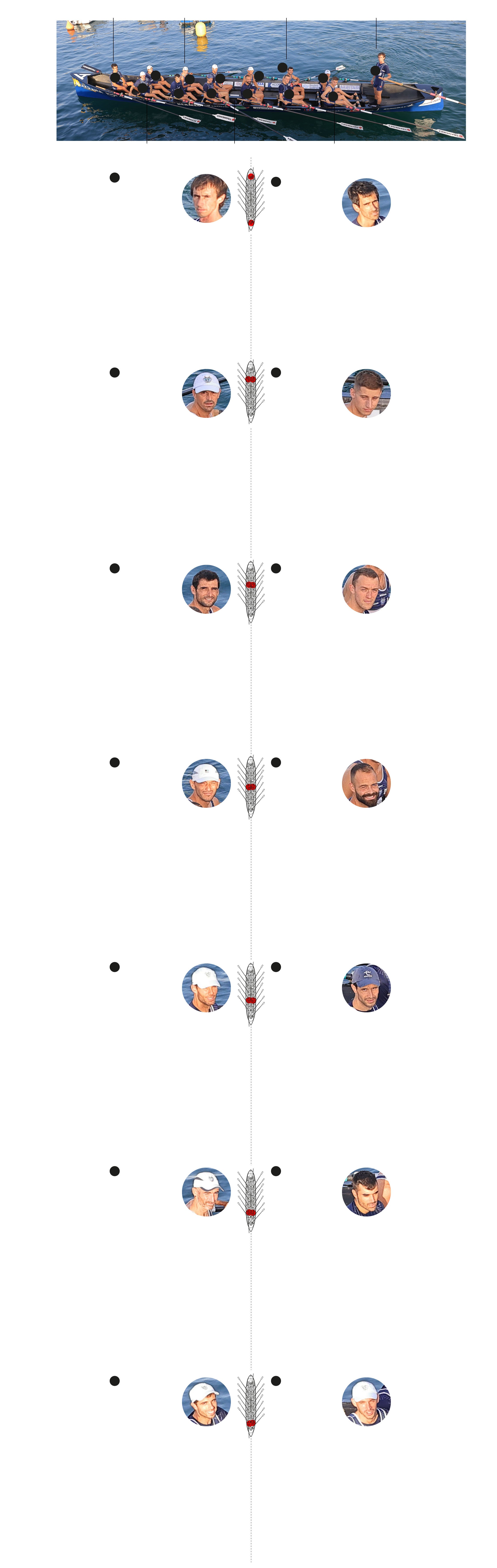 Cada puesto en la trainera es específico. No solo el del patrón o el proel, sino también el de los remeros, que se sientan por pares. Además, unos reman por babor, y otros por esctribor. Como hay un límite de peso para cada embarcación, incuidos los tripulantes, no basta con acumular músculo y potencia, sino que hay que distribuirlos según su peso y habilidad.