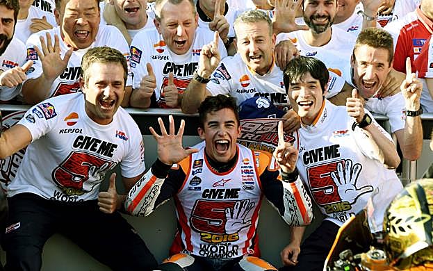 La carambola imposible se dio, y Márquez pudo cerrar su quinto Mundial en Japón, en casa de Honda, tras un complicado 2015: ganó la carrera mientras que las dos Yamaha de Jorge Lorenzo y Valentino Rossi terminaron por los suelos.
