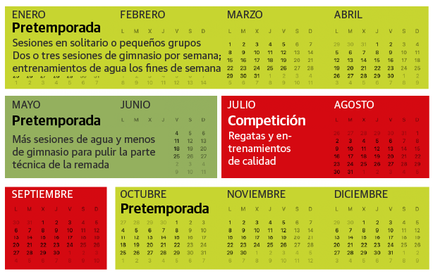 Además de en el bote, entrenan con pesas y, sobre todo, con el ergómetro (máquina de gimnasio que simula el movimiento del remo), además de bicicleta, cinta...
