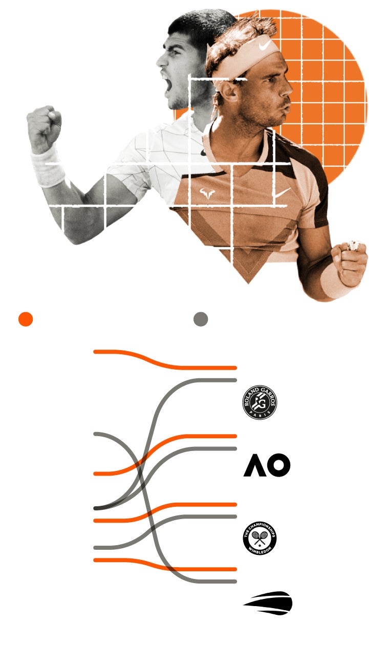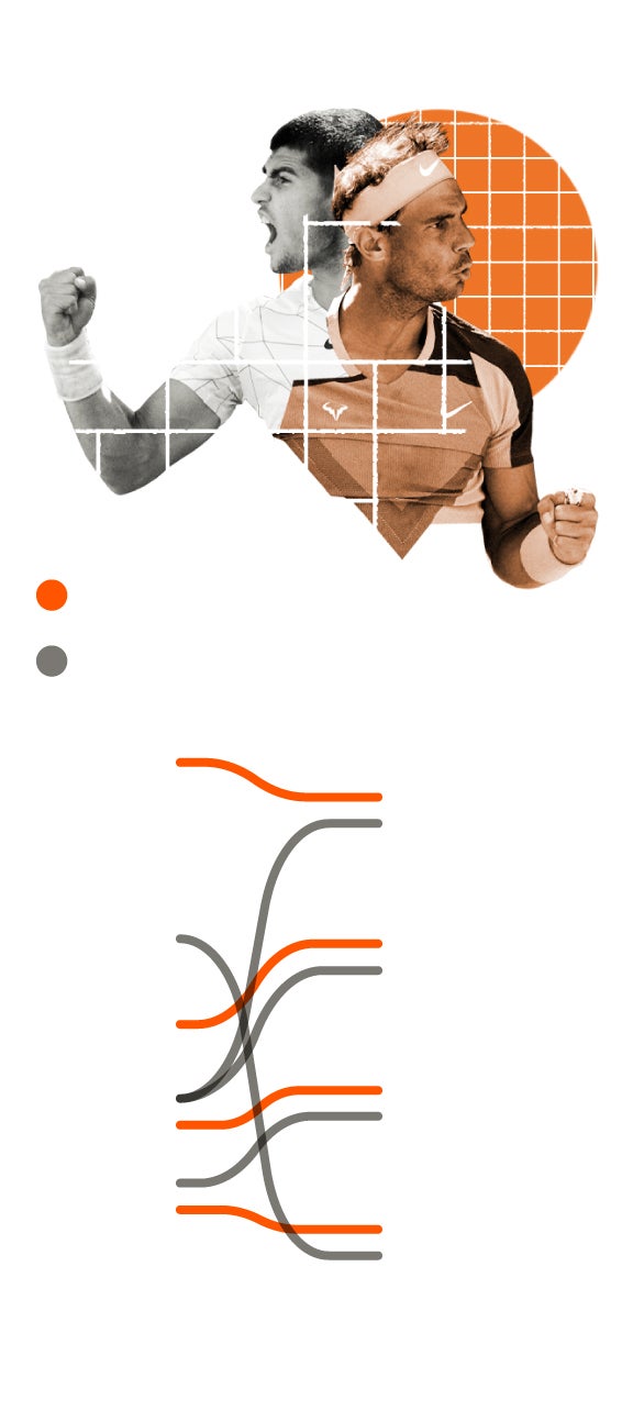 Las opciones de lograr un decimocuarto título también se complican por la explosión de Alcaraz, que llega a su segundo Roland Garros como el mejor tenista de la gira de tierra batida. Tras el título en Miami, se pegó el batacazo en la primera ronda de Montecarlo, pero espabiló pronto. Victorias en Barcelona y Madrid y descanso en Roma para evitar aumentar el estrés en el tobillo.