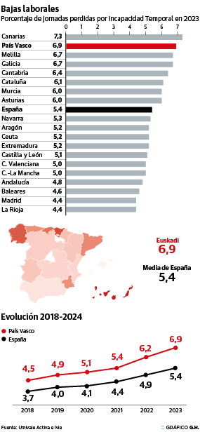 Euskadi siempre encabeza los ránking de absentismo en España, tanto cuando se observa en modo global -faltar al trabajo por cualquier motivo, justificado o no- ... como cuando solo se mide la Incapacidad Temporal (IT), es decir, las bajas por enfermedad. Así lo atestigua un nuevo informe según el cual en el País Vasco se perdieron el año pasado un 6,9% de las jornadas por esta causa frente al 5,4% de media nacional. Solo Canarias superó a Euskadi al llegar al 7,3%. El estudio, elaborado por la mutua Umivale Activa y el Instituto Valenciano de Investigaciones Económicas (IVIE), tiene la particularidad de que se basa en el registro de la Seguridad Social, con lo que es del todo fiable.