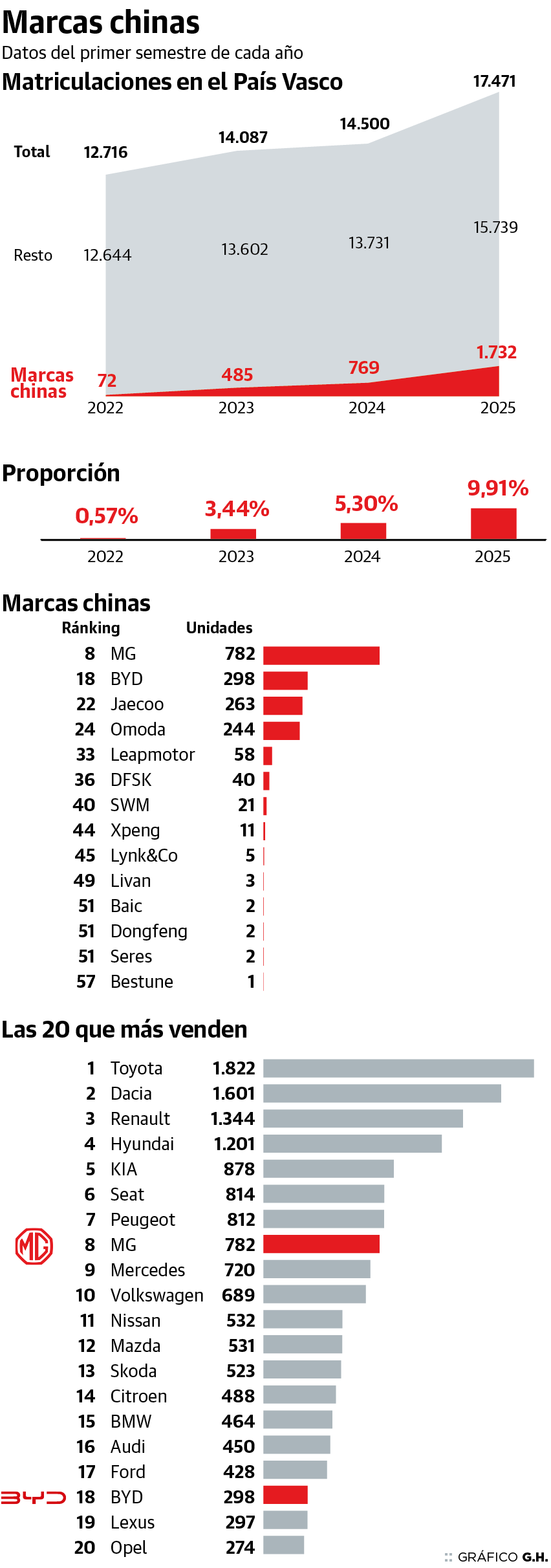La irrupción de los vehículos chinos en Euskadi ha sido tan rápida como contundente. En el primer semestre de 2022 apenas se matricularon 72 unidades con sello del gigante asiático. Este año, en ese mismo periodo, ya son 1.732, lo que supone multiplicar por 24 las cifras iniciales y duplicar las del año pasado, según datos de la Asociación Española de Fabricantes de Automóviles y Camiones. El mercado vasco abre así las puertas de par en par a unos fabricantes que ya amenazan la hegemonía europea y japonesa.