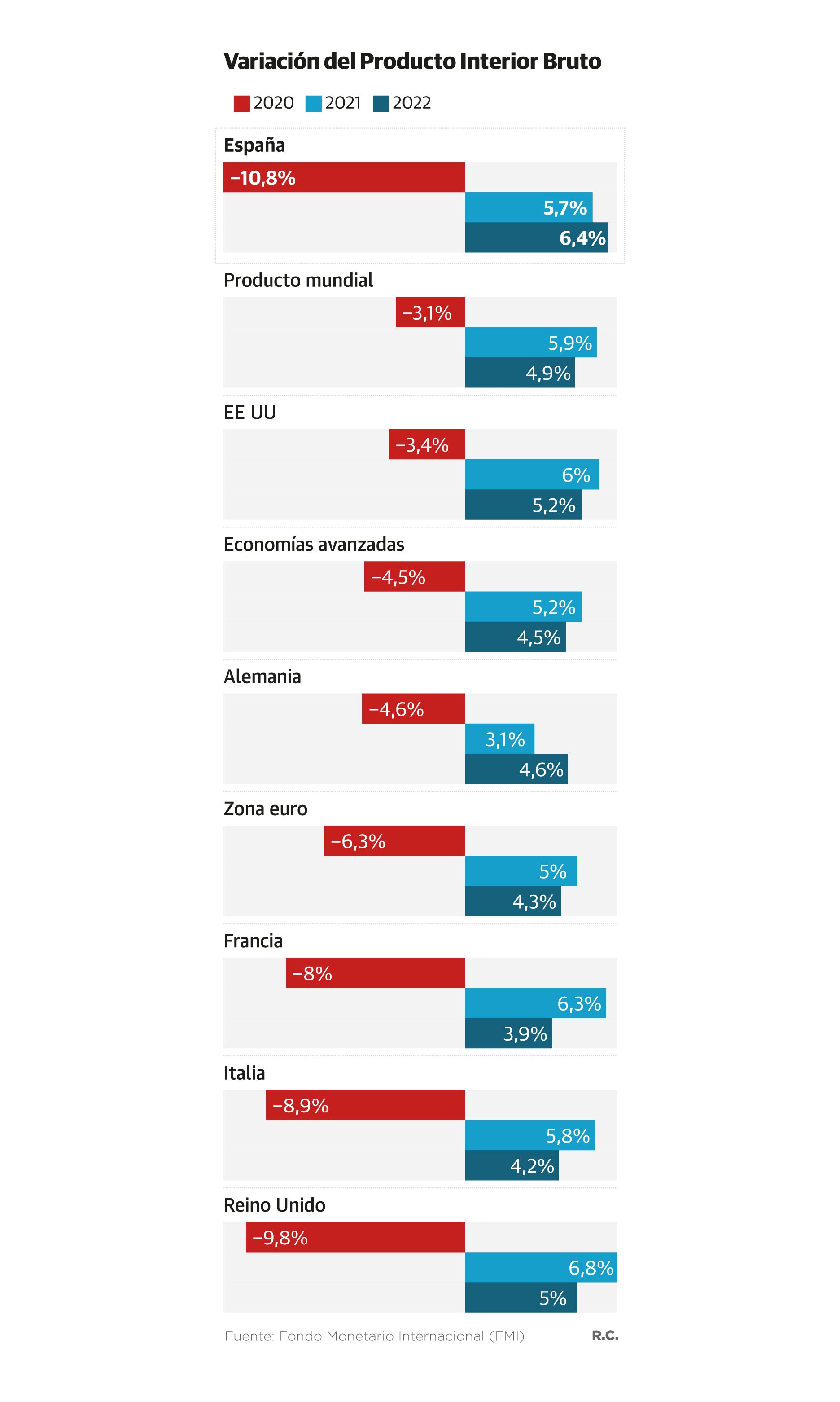 El último informe del Fondo Monetario Internacional (FMI) evidencia esta situación de manera excepcional. Es un hecho que, pese a la rebaja, la economía española crecerá un 5,7% frente al 5% de los países de la zona euro pero la misma cayó nada menos que un 10,8% el ejercicio pasado frente al 6,3% del resto. Exponentes como Italia o Francia crecerán más cuando su PIB se desplomó en menor medida y otros como Alemania lo harán menos pero se recuperarán antes ya que su estructura aguantó mucho más los efectos de la pandemia y el confinamiento. Se espera que esta misma semana la Unión Europea confirme estos datos con sus propios informes.