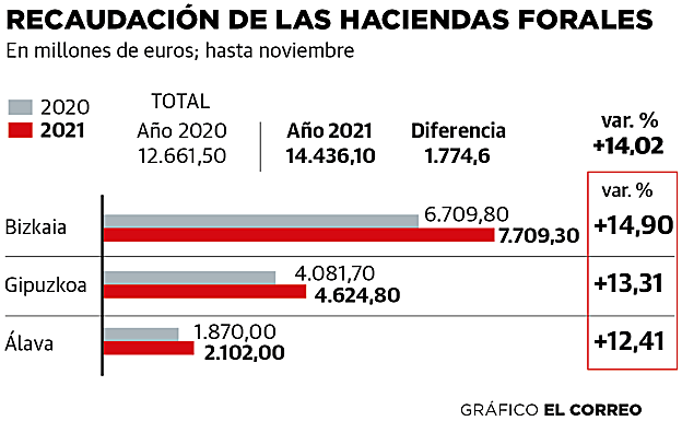 La maquinaria de ingresar de las diputaciones forales vascas sigue perfectamente engrasada. La recuperación de la economía en esta fase de la pandemia, el tirón ... del consumo e incluso algún elemento extraordinario, han permitido que los ingresos por impuestos hayan experimentado un auténtico despegue. A finales de noviembre, las haciendas de Bizkaia, Álava y Gipuzkoa habían ingresado un total de 14.436 millones de euros. Una cifra que supone 1.775 millones más que en los once primeros meses del pasado año. Esto es, un 14,02% más.