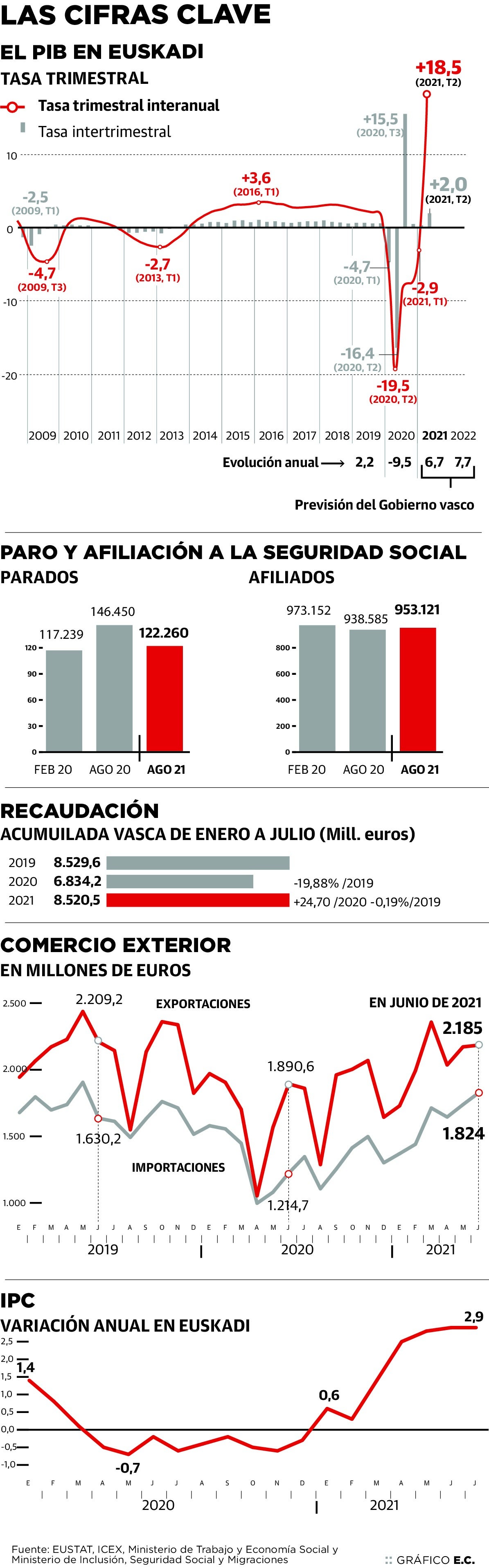 Otras magnitudes económicas que hacen que el lehendakari Iñigo Urkullu dijera esta semana que «en términos económicos Euskadi se acerca a la normalidad», son la fuerte recuperación del PIB (18,5% interanual), sustentada en una industria que remonta un 14% y unas exportaciones que crecen un 24% en el primer semestre.