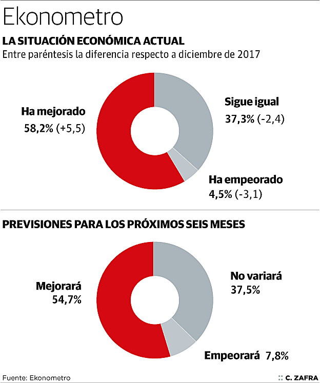 El contexto de crecimiento que vive la economía vasca ha propiciado que el octavo Ekonometro publicado por el Colegio Vasco de Economistas haya registrado la segunda valoración más optimista desde que arrancó el análisis en 2014. Un 58,7% de los encuestados –528 miembros de la entidad– considera que el escenario económico ha mejorado, mientras que el 37% piensa que no ha experimentado variaciones.