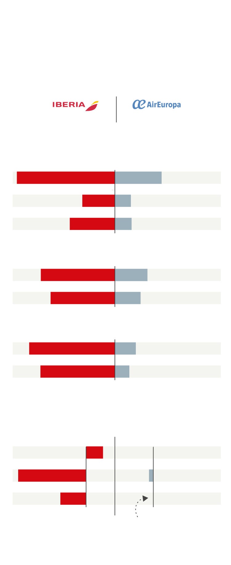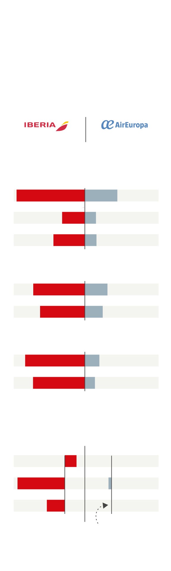 Por su parte, IAG registró unas pérdidas de 2.622 millones hasta septiembre. Una cifra negativa pero que también implica que se ha recortado a la mitad los números rojos de 5.576 millones de euros que se anotó en el mismo período del ejercicio anterior. Sus aerolíneas presentan una mejor evolución y recuperan mucho más rápido los pasajeros en 2021 mientras que Air Europa se mantiene este año con registros muy parecidos a los de 2020, en parte debido a su dependencia de trayectos más internacionales. IAG ha caído en Bolsa un 4,5%.