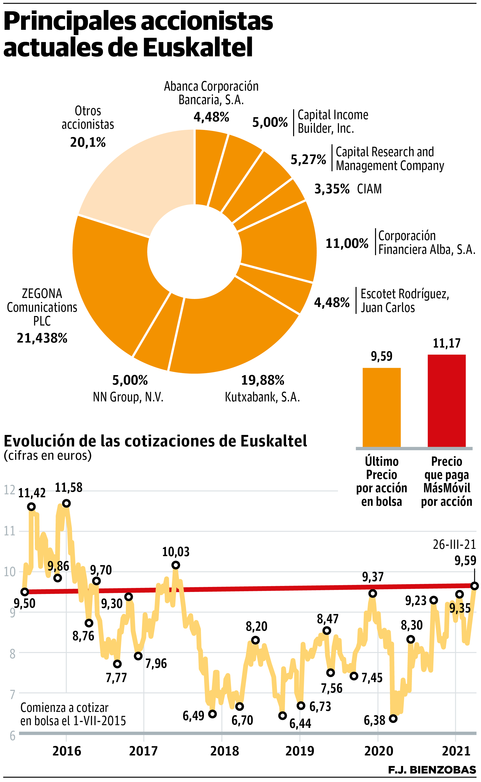 MásMóvil, el cuarto operador de telecomunicaciones de España, se apresta a absorberEuskatel, la empresa vasca que nació en 1996 gracias a un acuerdo político del PNV con el PP. MásMóvil anunció este domingo una OPA -una oferta pública de adquisición-, que tiene la vitola de «amistosa», después de haber alcanzado un acuerdo con los principales accionistas. Los propietarios del 52,32% de las acciones de Euskaltel -el fondo de inversión británico Zegona, Kutxabank y la Corporación Alba- han firmado un acuerdo de venta con carácter irrevocable. MásMóvil, sin embargo, ha condicionado la operación a tener el respaldo del 75% del capital social, para lo que ha hecho una oferta económica atractiva.