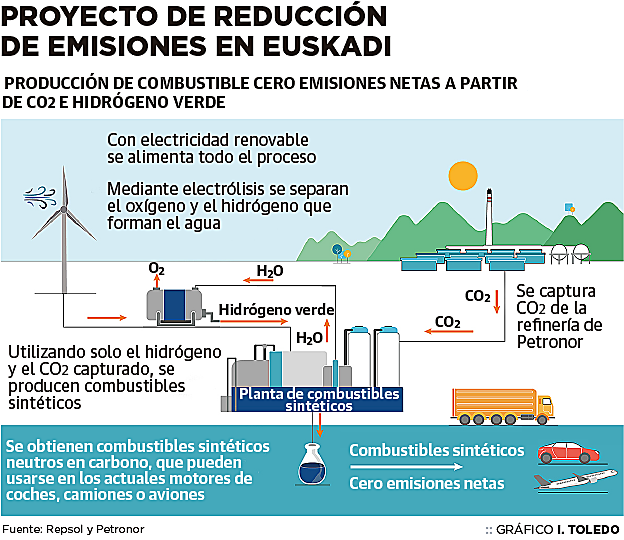 La tecnología que empleará Petronor en su nueva instalación no es nueva. Más bien todo lo contario, ya que tiene casi un siglo de existencia y fue desarrollada en 1925 por los científicos alemanes Franz Fischer y Hans Tropsch, e incluso la producción de combustibles con este procedimiento tuvo un gran auge en la Alemania nazi. La necesidad imperiosa de producir combustibles para alimentar la maquinaria de guerra aceleró la industrialización de esta tecnología –también la de la obtención de hidrocarburos a partir de carbón-, aunque su coste era desorbitado. Requiere mucha energía eléctrica en el proceso de producción, algo que hasta ahora ha sido una barrera infranqueable, en especial porque tiene que competir con el combustible obtenido a partir de petróleo, que resulta más competitivo en términos de costes. El desarrollo de las energías renovables y el abaratamiento de esa materia prima que es la electricidad ha permitido que esa tecnología se acerque ya a los umbrales de competitividad que necesita para sustituir al petróleo, aunque aún requiere de un desarrollo adicional. Esto es lo que precisamente el grupo Repsol quiere abordar en el País Vasco, ya que la instalación también ha seguido previamente un proceso de competencia interna dentro de la compañía hasta decidir dónde se ubicaba.