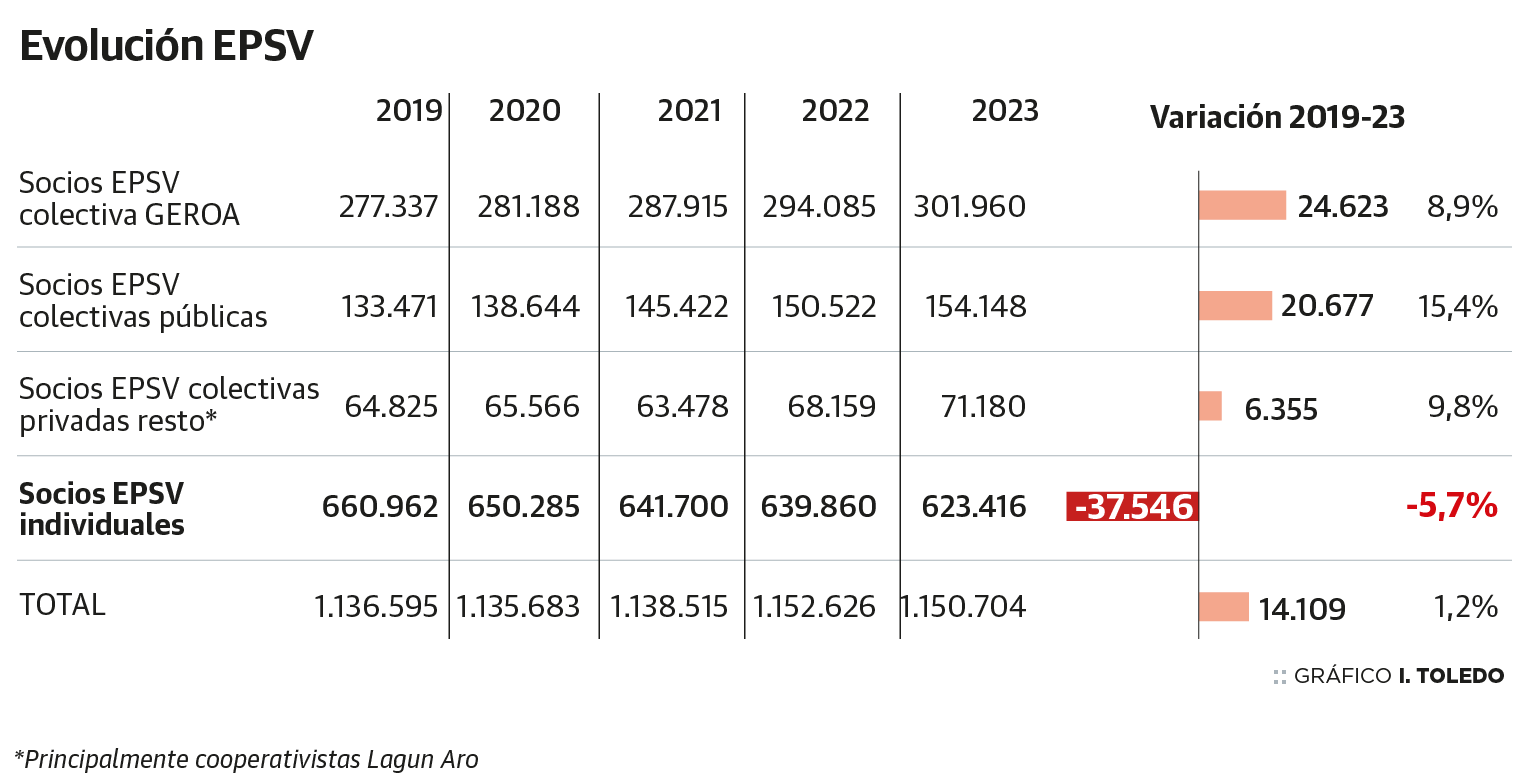 Geroa, la EPSV colectiva de empleo impulsada en Gipuzkoa por patronal y sindicatos, es la excepción. Desde que se puso en marcha ha incorporado ya a un total de 301.960 trabajadores con un crecimiento del 8,8% desde 2019. En esta fórmula, en la que aportan empresas y empleados, el rescate del ahorro solo puede ser tras la jubilación y en pagos mensuales, salvo desempleo o fallecimiento. Es el modelo que quiere impulsar el Gobierno vasco y su aplicación es a través de la firma de los convenios en cada sector.
