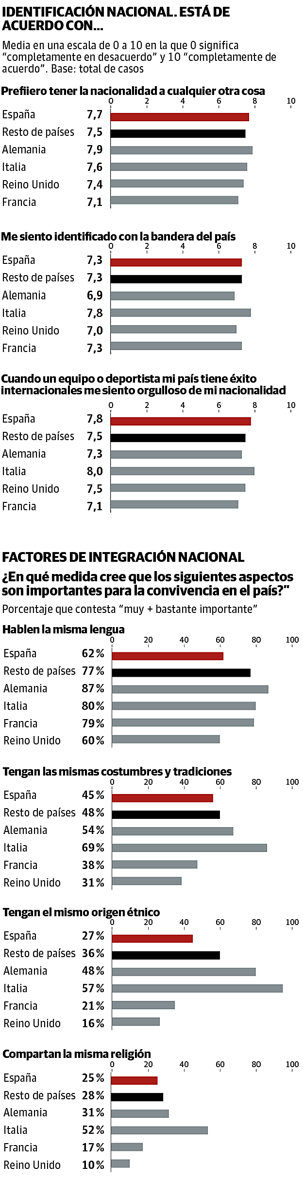 Uno de los bloques temáticos en el que las cinco grandes potencias están más homogéneas es el referido a la nacionalidad. A la pregunta de si prefieren tener la nacionalidad actual a cualquier otra, la media española es de 7,7 (la escala es del 0 al 10, siendo el 10 completamente de acuerdo). Alemania es el que lidera la clasificación con 7,9. Respecto a la identificación con la bandera, la nota española es del 7,3 (igual que la media), mientras que sube a 7,8 cuando se pregunta si se siente orgullo tras las victorias deportivas de las selecciones nacionales. Aquí ganan los italianos, con un 8.