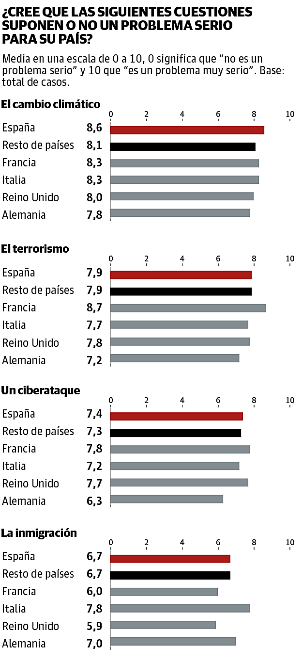 ¿En qué medida cree que las siguientes cuestiones supone un problema serio para su país? Los españoles lo tienen claro. El cambio climático recibe una nota media de 8,6 en una escala de 0 a 10. Lidera la clasificación, como también lo hace en Italia, Alemania y Reino Unido. El terrorismo es la segunda gran preocupación, con una nota de 7,9; seguido de un ciberataque (7,4) y la inmigración, con el 6,7. España, de hecho, es el país más proclive a la acogida de refugiados. Cuestionados sobre si es un «deber moral», la media que arroja la encuesta española es de 7,4 (sobre 10), mientras que en Reino Unido baja al 6,2; en Francia, al 6; en Italia, 5,7 y en Alemania, el 5,5