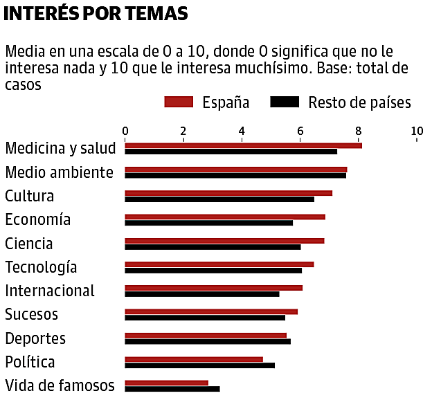 Primero, la foto fija. ¿Qué les preocupa a los españoles? Los autores del estudio ofrecieron a los encuestados una lista de once temas para que valorasen del 0 al 10 la importancia que dan a los mismos. El resultado, de mayor a menor preocupación es éste: Medicina y salud; medio ambiente; cultura; economía; ciencia; tecnología; temas internacionales; sucesos como robos o asesinatos; deporte; política y vida de los famosos. Sólo estos dos últimos capítulos están por debajo de 5.