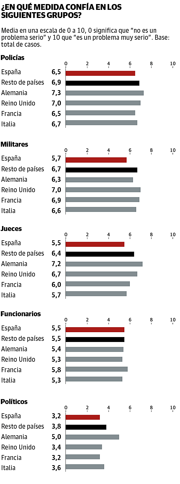 Los grupos profesionales que dependen del Estado están relativamente bien vistos por los españoles con la única excepción de los políticos. Eso sí, bastante por debajo de lo que sucede en Alemania, por ejemplo. Del 0 al 10, siendo el 10 la nota más alta, los que mejor parados salen son los policías, con el 6,5 (6,9 es la media europea); los militares, con el 5,7 (6,7); los jueces, con el 5,5 (6,4); los funcionarios, con el 5,5 (5,5) y los dirigentes políticos, con el 3,2 (3,8 en el resto de países). Respecto a las instituciones como tal, la mejor valorada es la universidad, con el 7,1 frente al 6,8 de la media europea. Y respecto al resto de profesiones, la clasificación es la siguiente: médicos (7,9); maestros (7,5), científicos (7,3) e ingenieros (6,9). En mitad de tabla están los empresarios (5,1) y suspenden los sacedortes (3,7), los banqueros (3,4) y los dirigentes políticos (3,2).