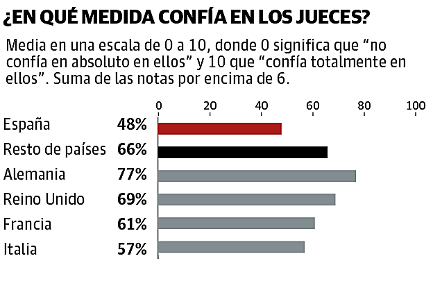 La percepción que tienen los españoles de la justicia no es mala, pero sí mejorable. ¿En qué medida confían en los jueces? El 24% les ubica en el rango mayor, el que ofrece una nota entre el 8 y el 10. Sin embargo, este porcentaje es muy inferior al de la media europea (35%), aunque superior al de Italia (19%) y similar al de Francia (27%). Dominan la tabla los británicos, con el 41%, y sobre todo los alemanes, con el 51%.