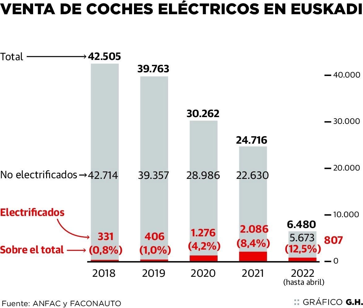 El pasado abril salieron de los concesionarios menos de la mitad de los coches que se habían vendido en el mismo mes antes de la ... pandemia, en 2019. La incertidumbre ante los cambios de regulación y la crisis han frenado la matriculación de vehículos nuevos. Las ventas se han desplomado... salvo en el caso de los híbridos y los eléctricos. Es cierto que se trata de un sector que partía de cifras residuales, pero consolida un crecimiento imparable. Así, en los primeros cuatro meses de este 2022 las matriculaciones de coches electrificados (híbridos enchufables y eléctricos 100%) en el País Vasco han ascendido hasta las 807 unidades. Son un 42% más que el pasado año, según se desprende de los datos de ANFAC, la Asociación Española de Fabricantes de Automóviles.