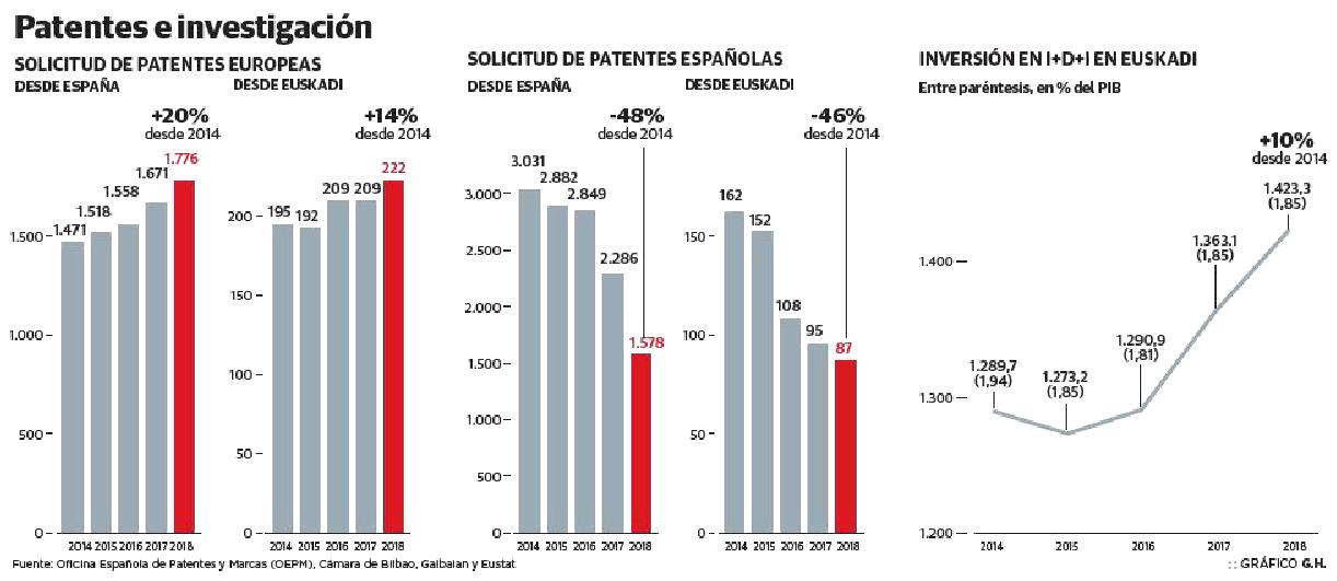 La economía vasca está en los niveles más altos de su historia en inversión en I+D+i (Investigación, Desarrollo e innovación) con 1.420 ... millones de euros, pero esto no se traduce en una avalancha de solicitudes de patentes. Al contrario, en el periodo 2014-2018, últimos datos oficiales disponibles, las peticiones están estancadas e incluso tienden a la baja, con un 13% acumulado. En cifras reales, desde Euskadi se registran unas 380 solicitudes anuales, incluyendo el registro español y el europeo. No hay una explicación sencilla para este fenómeno: mientras en algunas producciones industriales estamos al nivel de Alemania, lo cierto es que la tasa de solicitud de patentes alemanas por millón de habitantes llega hasta las 321 cuando la vasca se queda en 102 y la española se limita a 38.