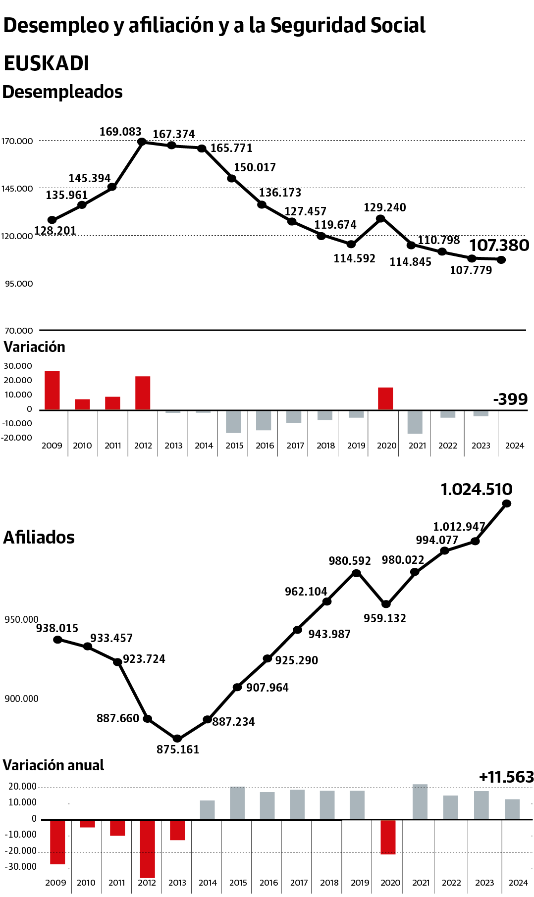 Los datos se complementan con una bajada del paro registrada en Lanbide. El departamento de Economía, Trabajo y Empleo del Gobierno vasco destaca que al cierre del 2024 se registraron 107.380 personas desempleadas, esto es 399 menos que el año anterior. En la progresión mensual, en diciembre también cayó un 0,48% respecto al mes previo al reducirse los desempleados en 514 personas.