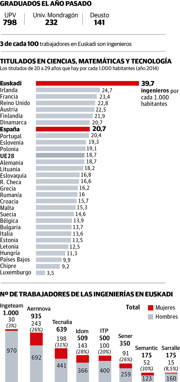No cabe duda de que la principal razón por la que Euskadi puede presumir de ser tierra de ingenieros es precisamente la fortaleza de su industria, una red muy potente no solo de fábricas -Mercedes, Gestamp, Petronor, Corporación Mondragón...- sino también de centros punteros de investigación -Idom, Ingeteam, ITP, Aernova, Sener, Tecnalia...- que se nutren de este tipo de profesionales desde hace décadas. Según los datos recogidos por el Eustat en su última encuesta sobre población ocupada (2016), solo en las empresas ubicadas en el País Vasco trabajan más de 25.000 ingenieros -3 de cada 100 trabajadores en activo-, unas cifras que confirman la «pujanza» de un sector profesional con «gran arraigo» en la comunidad autónoma vasca en sus diferentes especialidades, desde industriales -la especialidad mayoritaria- a telecomunicaciones, informática, mecánica, electrónica...