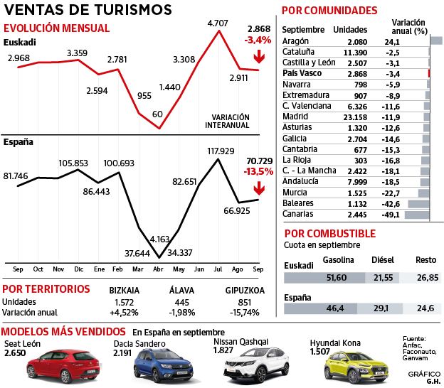 Después de dos meses -julio y agosto- de importantes aumentos en las ventas de turismos en Euskadi, impulsadas en gran medida por las ayudas económicas ... del Renove vasco, y una vez finalizado este plan el 2 de septiembre al haberse consumido su dotación de 10 millones de euros, las matriculaciones de vehículos volvieron a terreno negativo el mes pasado. No obstante, la caída en el País Vasco fue bastante menor -un 3,4% respecto a septiembre de 2019- en comparación con la sufrida por el conjunto de España, que fue de 10 puntos más; en concreto, del 13,5%.