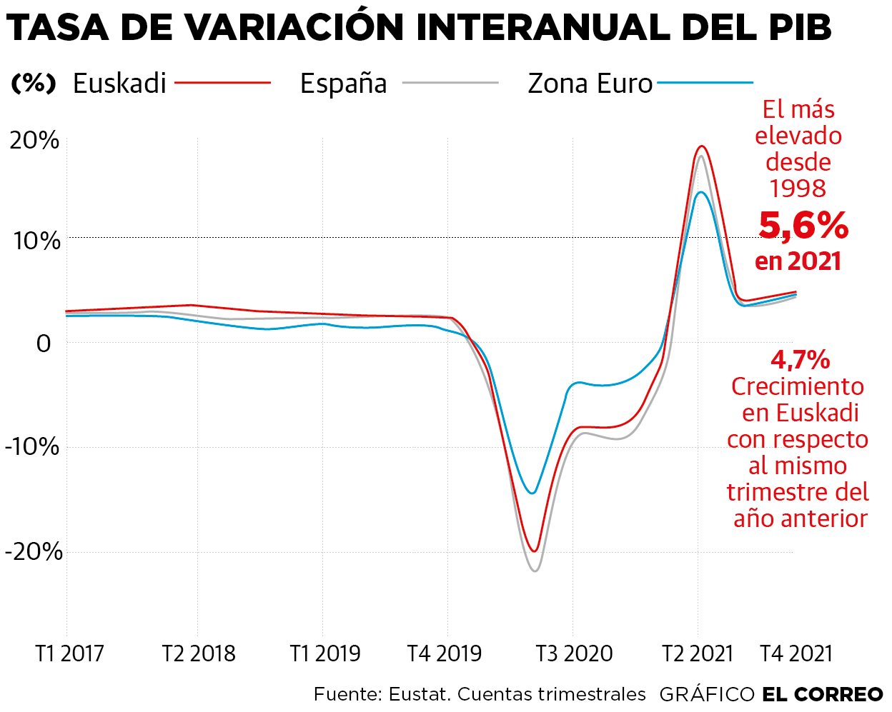 Azpiazu ha hecho el anuncio en su valoración sobre las cuentas de la comunidad autónoma del pasado año, cuando se creció un 5,6%, la tasa más elevada desde 1998. La expansión vivida en 2021 por la economía vasca fue «muy importante y algo superior a la media de los países europeos, que incrementaron su PIB un 5,2% en media anual». A pesar de ello, todavía no se ha recuperado el PIB previo a la pandemia, algo que se esperaba conseguir en el segundo trimestre de este año.