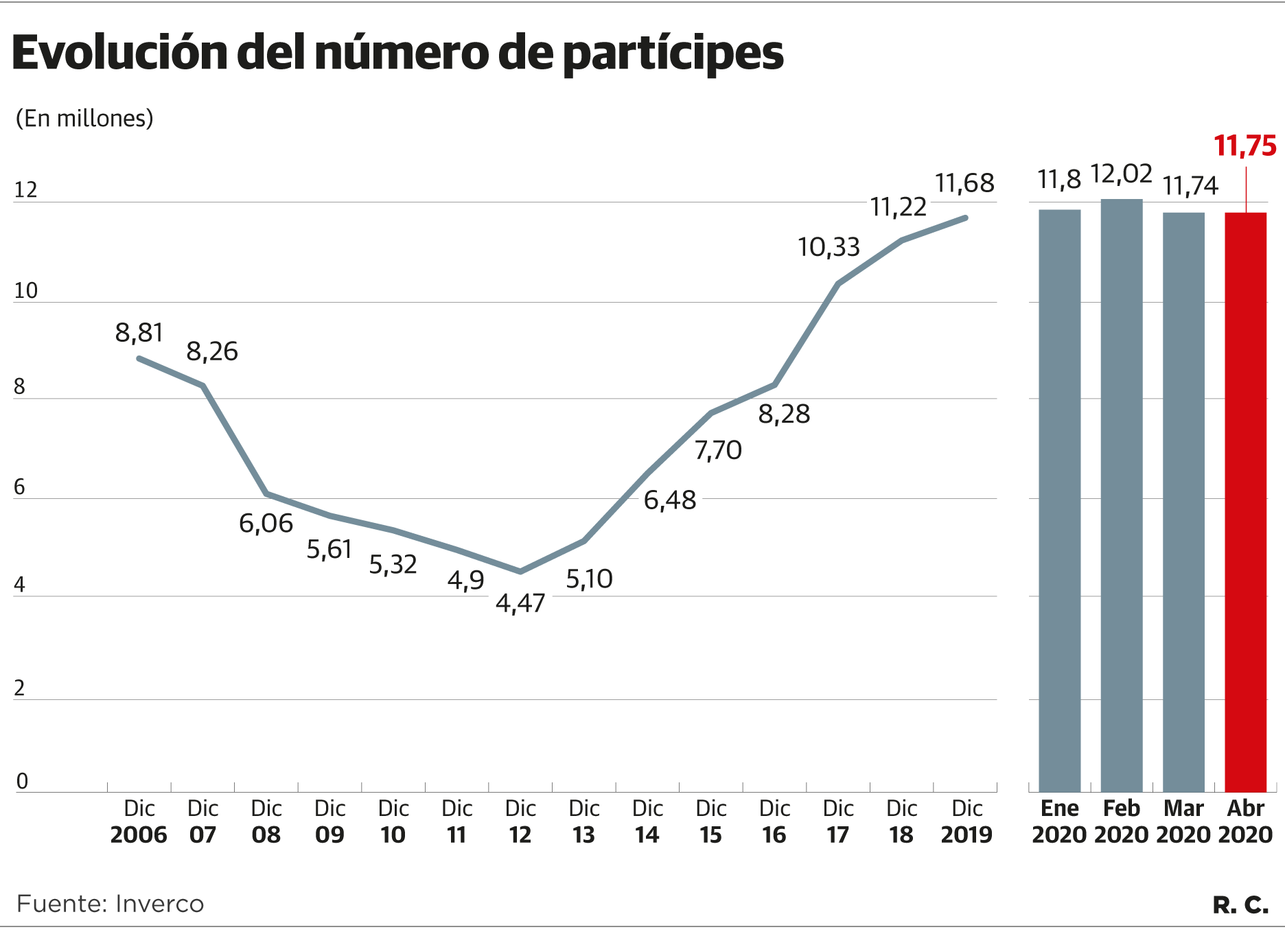 En la crisis de 2008 y hasta 2012, la caída del número de partícipes de fondos fue drástica: pasaron de 8,8 a 4,47 millones. Ahora parecen más resistentes: a cierre de abril había más partícipes de fondos que al final de 2019. Según José Luis Manrique, de Inverco, ello se debe a la mayor cultura financiera; a que las carteras ya no están compuestas, como en 2008, en más de un 70%por renta fija a corto plazo, monetarios y garantizados, sino que ahora estos productos sólo pesan un 35%;y al envejecimiento de la población, que conlleva menos necesidades financieras a corto plazo. En definitiva, según Paula Mercado, de VDOS, la mayoría de inversores son a largo plazo. Victoria Torre, de Singular Bank, añade que a los inversores les ha podido frenar un fenómeno anómalo:que todo cayera a la vez. Eso ha mermado la capacidad de reacción. Pero no se descartan más reembolsos si la crisis persiste y cada vez más personas requieren recuperar ahorros.