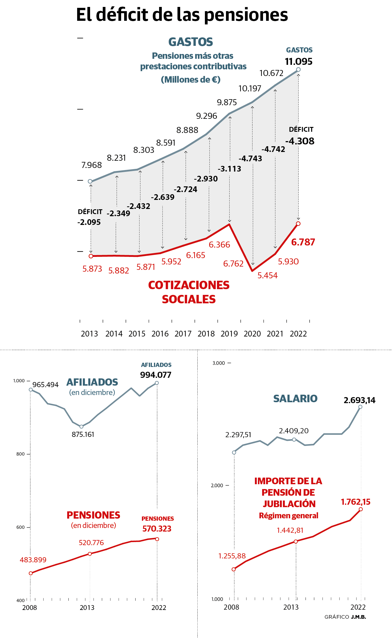 Los números evidencian los problemas de un sistema sobrecargado por una población muy envejecida que cada vez cobra pensiones mayores. En 2013, la factura de las prestaciones contributivas (pensiones, incapacidad temporal...) sumaba 7.968 millones y las cotizaciones ascendían a 5.873 millones, según los datos de la Seguridad Social. En 2022 la partida de gasto había crecido un 39% hasta los 11.095 millones y las de los ingresos solo un 16%, hasta los 6.787. Esta diferencia explica el crecimiento del agujero.