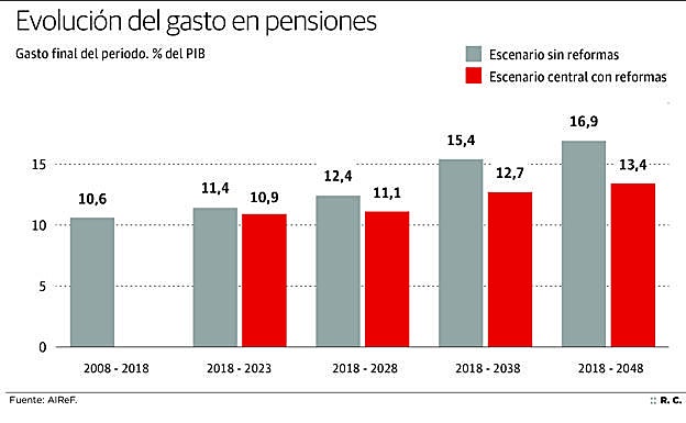 Otra cosa distinta es qué hacer a largo plazo. A juicio del ahora ministro la vía es profundizar en las reformas de 2011 del anterior Gobierno socialista de Zapatero. El informe elaborado por el nuevo secretario de Estado de Seguridad Social, bajo la dirección de Escrivá en la AIReF, propugnaba retrasar la edad efectiva de jubilación un año y aumentar de 25 a 35 años de cotización el periodo de cómputo para calcular el importe de la prestación. Ambas medidas lograrían reducir el gasto en pensiones en hasta 1,7 puntos del PIB en 2048.