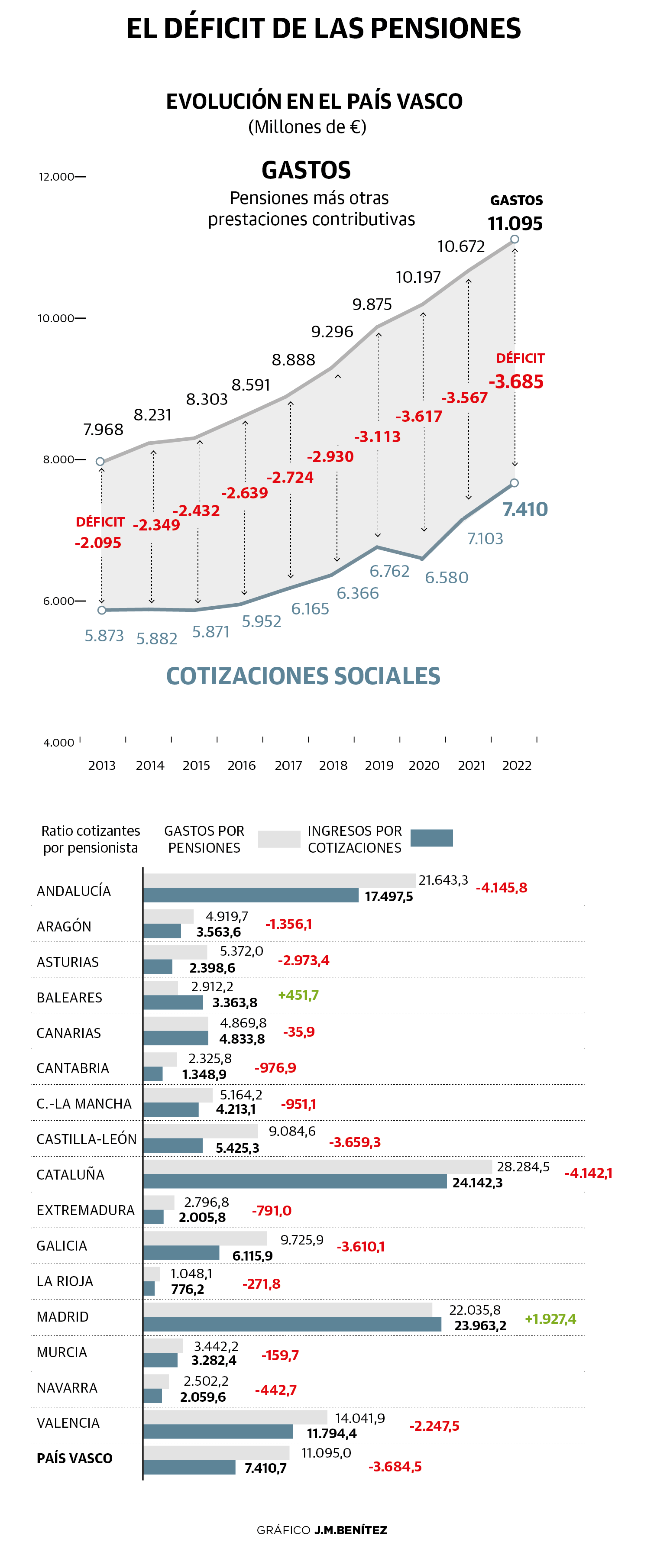 El déficit, derivado de unos ingresos por cotizaciones de 7.410 millones en el año y unos gastos de 11.095 millones, no ha parado de crecer (en 2013 era de 2.100 millones) y lo seguirá haciendo en los próximos años debido al acusado envejecimiento de la población vasca, que encima disfruta de las pensiones más altas de toda España. Aunque en Euskadi el desequilibrio es especialmente grave, la mayoría de comunidades presenta desajuste, con la excepción de Madrid y Baleares, y el agujero se está tapando con transferencias del Estado.