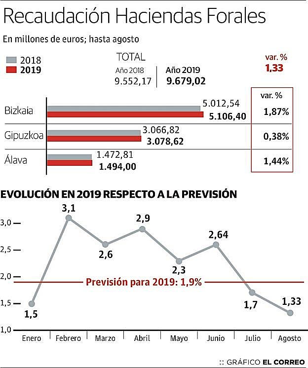 No hay alarmas encendidas, pero sí luces de color ámbar que invitan a la precaución. Desde ayer ya está sobre la mesa un nuevo dato - ... en este caso real y contable, no de prospectiva-, que apunta de forma clara a la tendencia de la desaceleración económica e invita a tomar con mucha prudencia cualquier consideración sobre el gasto público. Al finalizar el pasado mes de agosto, los ingresos de las haciendas forales vascas habían alcanzado la cifra de 9.679,02 millones de euros, lo que supone 127 millones más que en el mismo periodo de 2018. A pesar de que esos datos son positivos, lo cierto es que representan un aumento del 1,33%, tasa que comienza a alejarse de las previsiones para este año, fijadas en el 1,9%.