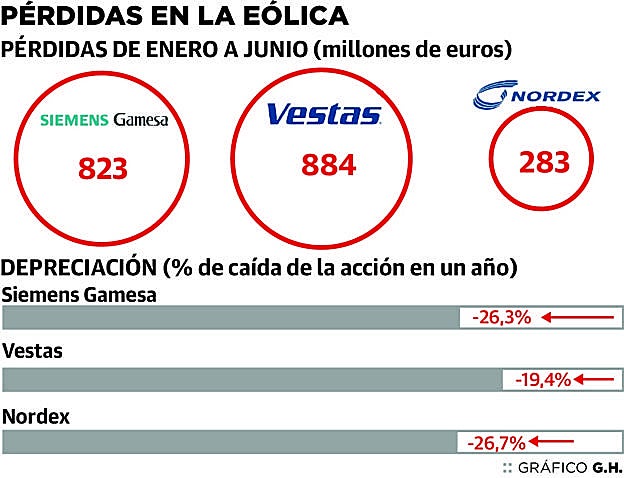 Los números rojos y las dificultades no son solo un elemento que acompañe a Siemens Gamesa, sino que todo el sector eólico, especialmente el terrestre, ... está acusando una dinámica que ha disparado las pérdidas de los principales constructores europeos. Así, la compañía vasco-germana, la danesa Vestas y Nordex, empresa impulsada por la española Acciona con sede en Alemania, acumulan en el primer semestre del año 1.990 millones de euros en pérdidas.