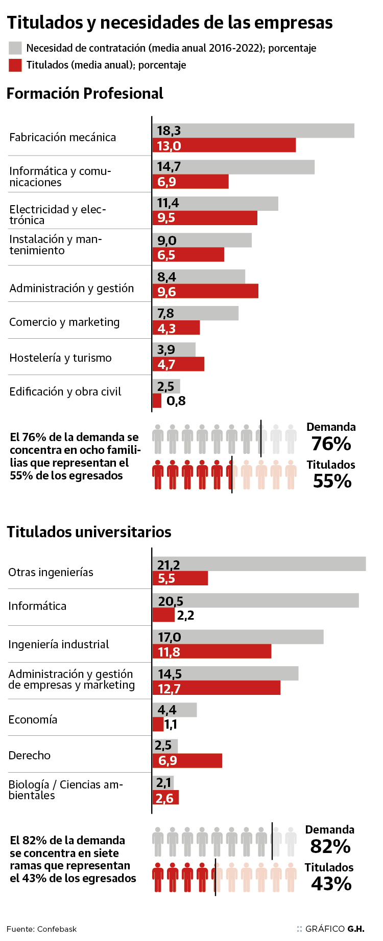 Estos datos están sacados de un informe realizado por la patronal en el que contrasta los perfiles que demandan las empresas con los egresados en los últimos años. Empezando por la universidad, que es donde se da el mayor desajuste, Confebask explica que el 82% de los empleos que ofrece el sector privado se concentra en siete grados: Ingeniería industrial, 'otras ingenierías', informática, administración y gestión de empresas, economía, derecho y biología. Pues bien, solo un 43% de los titulados -suman un total de 8.500 cada año en la UPV/EHU, Deusto y Mondragón- escogió esas ramas.