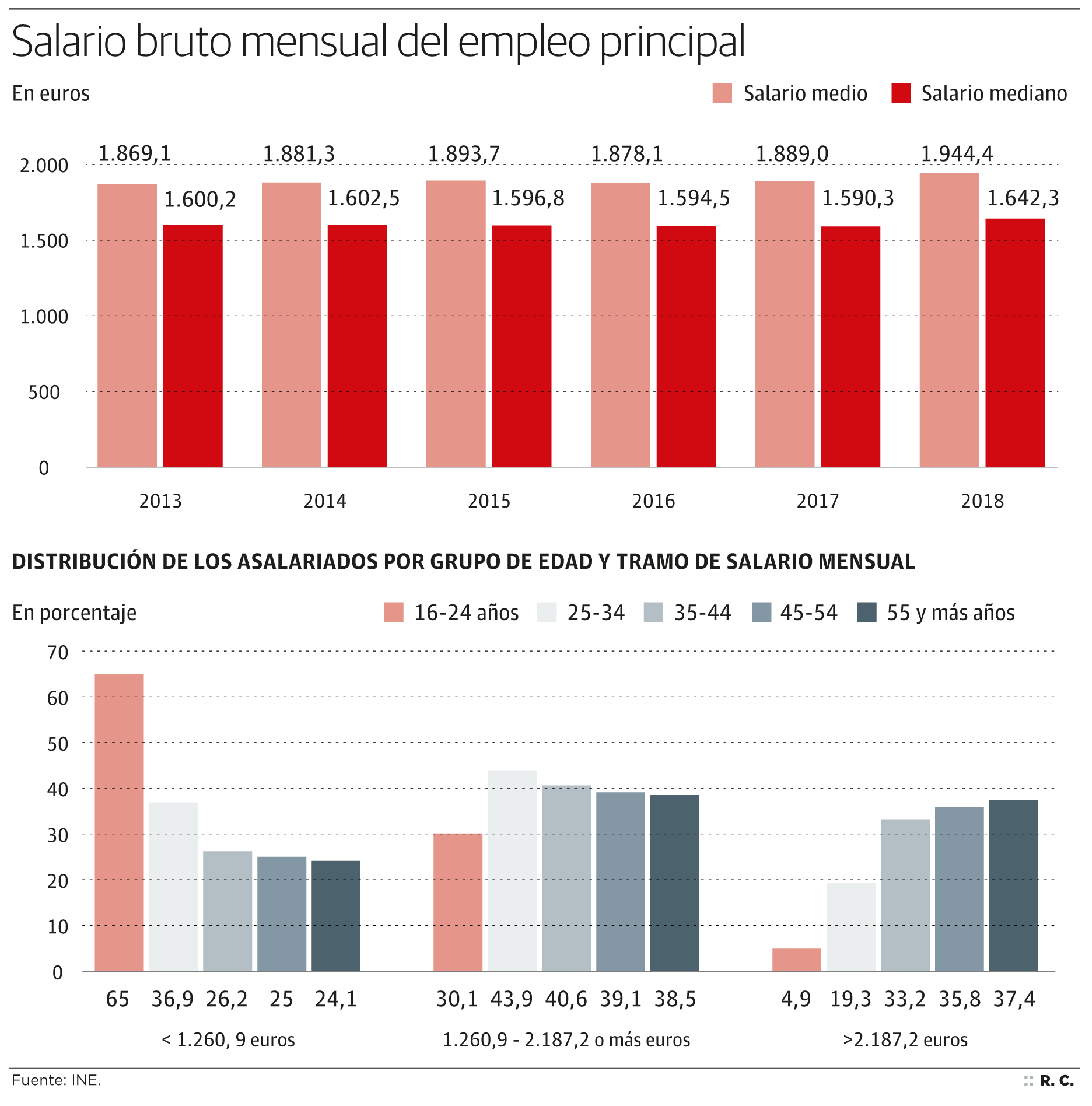 Los datos del INE demuestran que los salarios más bajos se concentran en los trabajadores más jóvenes, mientras que los de mayor edad tienen un peso mayor en los sueldos más altos, como es normal por los ascensos, antigüedad en el puesto o cambios de trabajo que se van logrando a lo largo de la vida. Sin embargo, destaca el hecho de que los trabajadores de entre 25 y 34 años -que deberían haber terminado ya los periodos de prácticas- siguen teniendo en el 37% de los casos sueldos 1.260 euros brutos al mes, lo que significa menos de 15.000 euros al año.