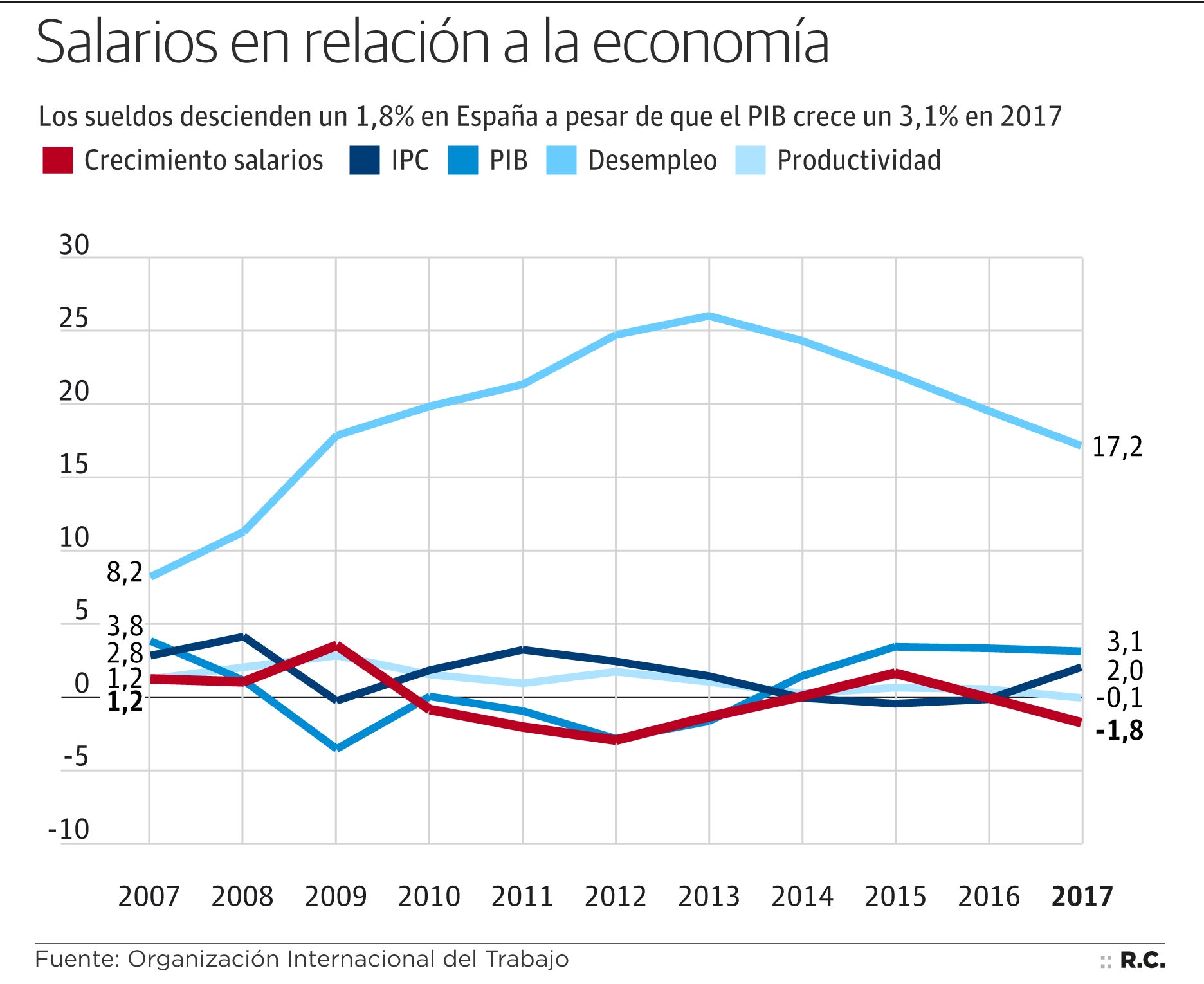 Así, España se convierte en el segundo país con peor dato en materia de salarios de la eurozona, solo por detrás de Grecia (-3,5%). Más grave aún, España es uno de los países donde más ha subido la productividad en los últimos 5 años pero donde menos han subido los sueldos. Así, a pesar del aumento del PIB, la contención de la inflación cerca del 2% en 2017 y la «considerable» disminución del desempleo del 19,6% al 15,6% en un año, el valor de los salarios equivalió al 96% del valor que tenían en 2008, lo que supone «una pérdida de poder adquisitivo para los trabajadores».