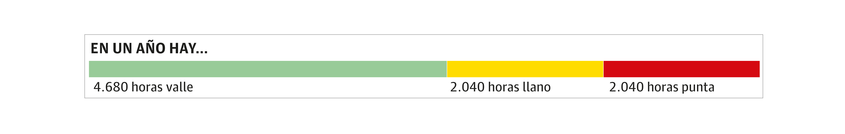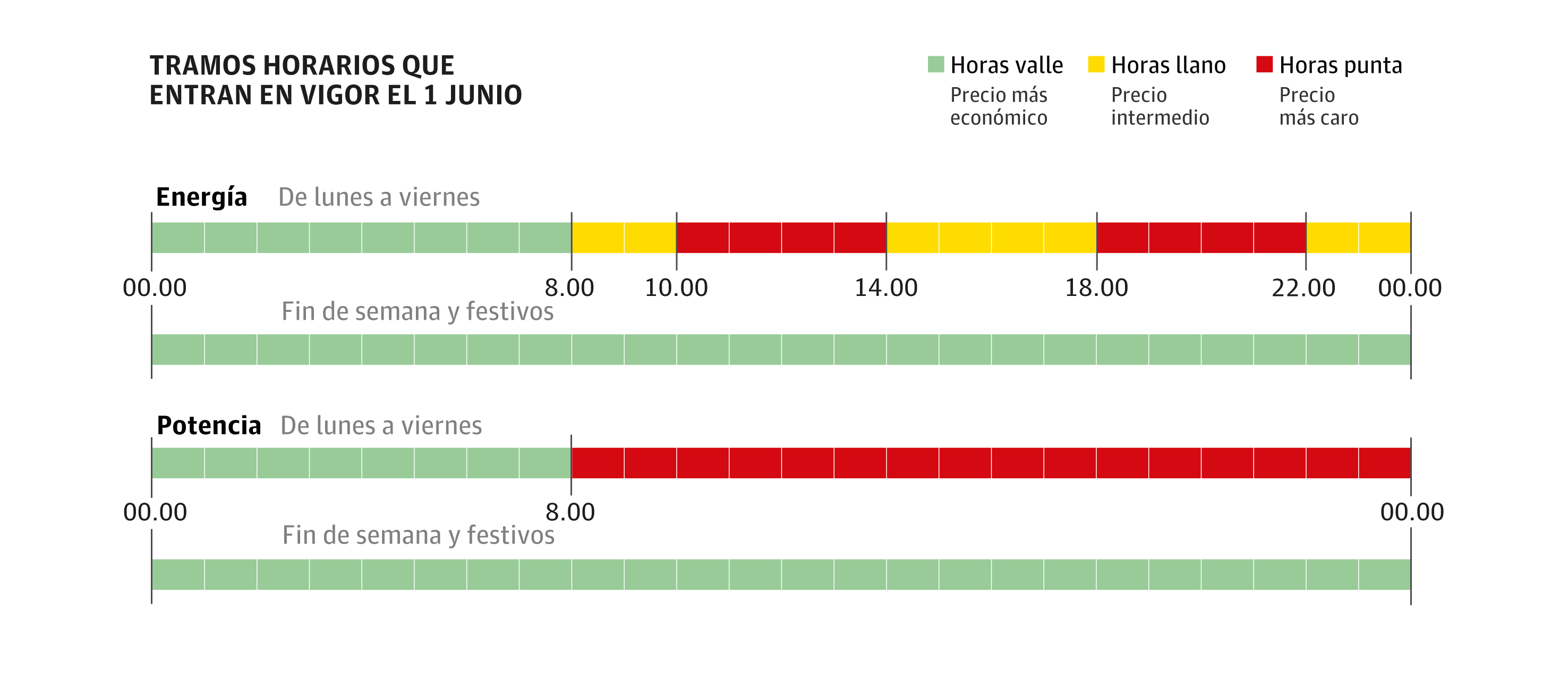Los nuevos horarios ya se encuentran meridianamente definidos: el tramo más barato (el valle) va desde las 00.00 hasta las 08.00 horas, así como todo el fin de semana y los festivos; el intermedio (llano), de 08.00 a 10.00 y de 14.00 a 18.00 horas, de lunes a viernes. Y también en esos mismos cinco días, el tramo más caro (punta) se encuentra fijado de 10.00 a 14.00 horas, y de 18.00 a 22.00 horas.