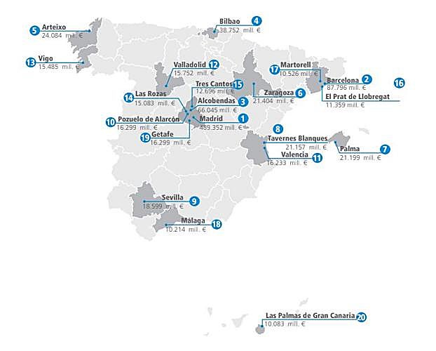 Según el estudio Madrid es, con mucha diferencia, la ciudad cuyas empresas generan unos mayores ingresos: son casi 490.000 millones de euros, cifra cinco veces superior a la de Barcelona, que con la mitad de empresas (32.790, frente a las 64.101 de Madrid) se queda en 87.800 millones de euros. La capital de España concentra el 27,65% de la facturación de las 617.026 sociedades españolas con ingresos declarados en 2017. Barcelona presenta el 4,96% y Alcobendas, el 3,73%.